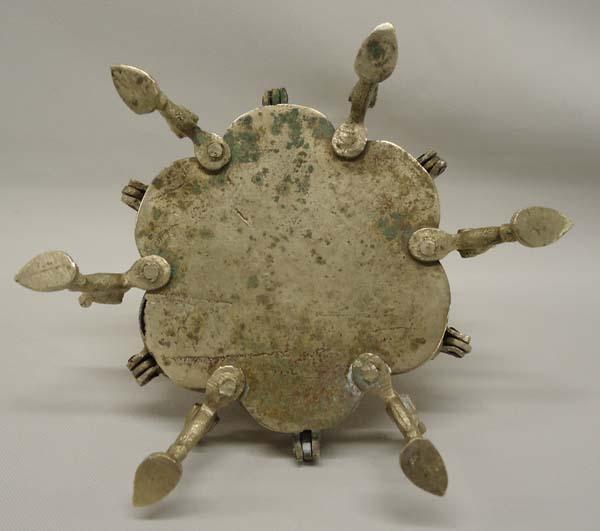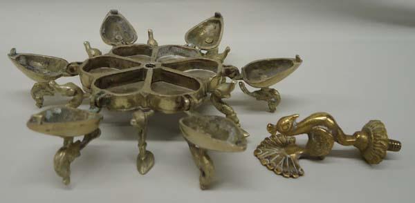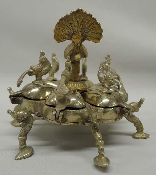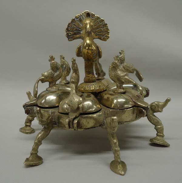 Six Legged Brass Face Paint Box With Peacock Motif, made in India. Measures approx. 3 1/2''H x 4'' circumference. SHI $20.