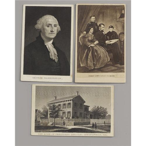 <B>Six Lincoln-related CDVs.</B></I> Each of the Cartes de Visite images here is inscribed on the verso as follows: "<I>Purchased at Oak Ridge Cemetery Springfield, Ill Dec. 5th, 1865 by Henry A. Whitney</B></I>". Whitney mustered out of the 33rd Illinois Infantry in Vicksburg, Mississippi with the rank of Sergeant on November 24, 1865. It would seem likely that he was a great admirer of Lincoln's and made a side pilgrimage to the slain president's tomb while returning home to Milford, Illinois. The CDVs include "President Lincoln And Family", "George Washington", ""President Lincoln's Tomb", "President Lincoln's Tomb - Interior View", "Home of President Lincoln - Springfield, Ill", and "President Lincoln's First Home in Illinois". The tomb views are from life, however the others are from engravings.The images average very good condition with the usual light aging. This is a special grouping since it was formed by a mourning veteran just as soon as he was able to do so.<BR><BR><b>Shipping:</b> Small Collectibles (<a target="_blank" href="http://www.heritageauctions.com/common/shipping.php">view shipping information</a>) <BR><BR><B>Important not
