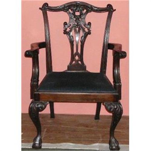 This is a set of six Chippendale style dining chairs. There are four identical side chairs and two similar arm chairs. They are beautfully carved with ball and claw feet.