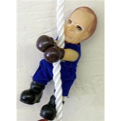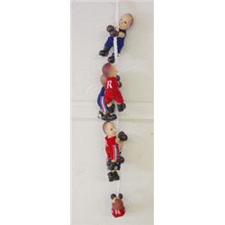 These six men are all climbing a rope and are wearing sporting outfits and glasses. Three are in red and three are in blue. They are approximately 4 inches. They are made of plastic and all are wearing boxing gloves. All six look alike. They are in good condition.
