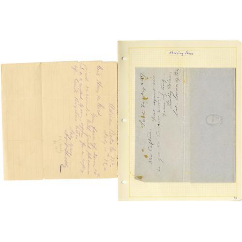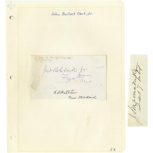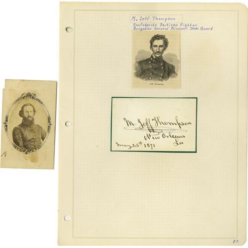 <B>Six Missouri Confederates.</B></I> Group of seven signatures representing six officers from Missouri. Included are:<BR><B>John B. Clark, Jr.</B></I>- clipped signature, very fine condition.<BR><B>John B. Clark, Jr.</B></I>- signature card, some soiling, fine condition.<BR><B>John S. Marmaduke.</B></I>- clipped signature, very fine condition. Marmaduke later become Governor of Missouri and to this day one can hear "Marmaduke's Hornpipe" played by Missouri fiddlers,<BR><B>Sterling Price</B></I>- ANS, 1847, a few stains not affecting signature, fine condition.<BR><B>Joseph Shelby</B></I>- ALS, one page, Adrian, Missouri, July 10, 1882, to General Henry M. Gist, fine condition. "Jo" Shelby was, surprisingly, a U.S. Marshall during his later years. In 1865 he had refused to surrender, fleeing to Mexico with Price and other diehard Confederates.<BR><B>Alexander E. Steen</B></I>- Small albumen print, 2.25" x 4", signed on the verso. One corner clipped, some soiling, else very good condition. Steen was killed at Kane Hill, Arkansas on November 27, 1862.<BR><B>M. Jeff Thompson</B></I>- signature card, 1871. Very fine condition. Thompson, the "Missouri Swamp Fox", was the bane of Federals in Southeast Missouri.<BR><BR><b>Shipping:</b> Small Flat (<a target="_blank" href="http://www.heritageauctions.com/common/shipping.php">view shipping information</a>) <BR><BR><B>Important noti