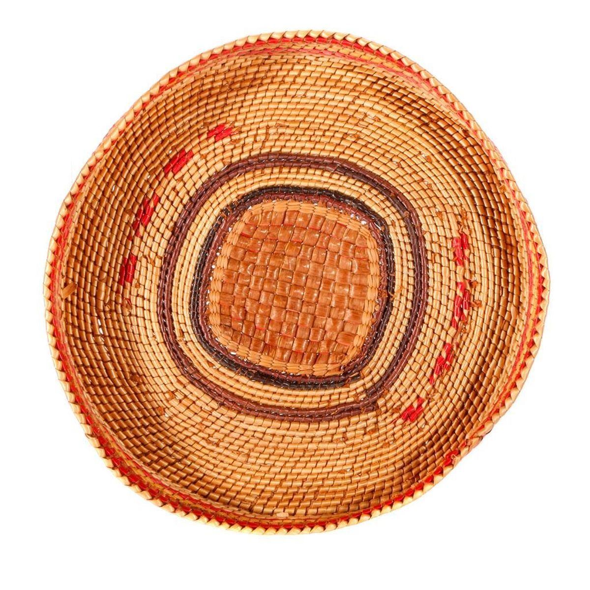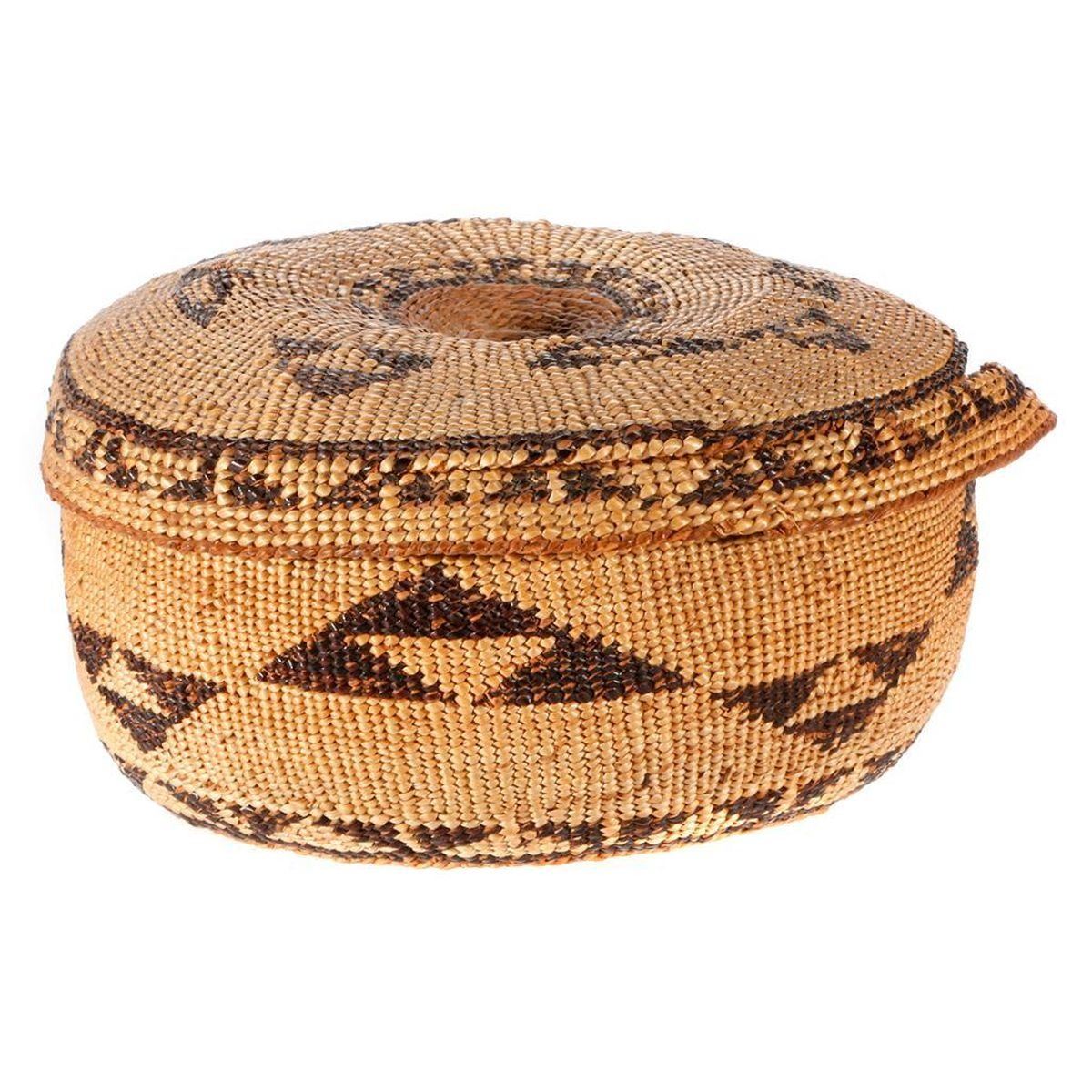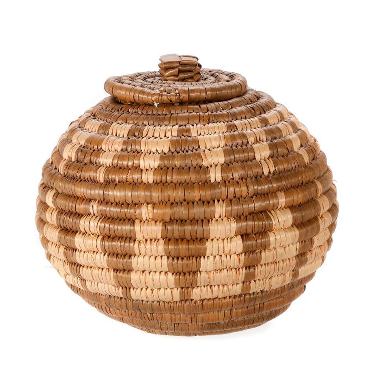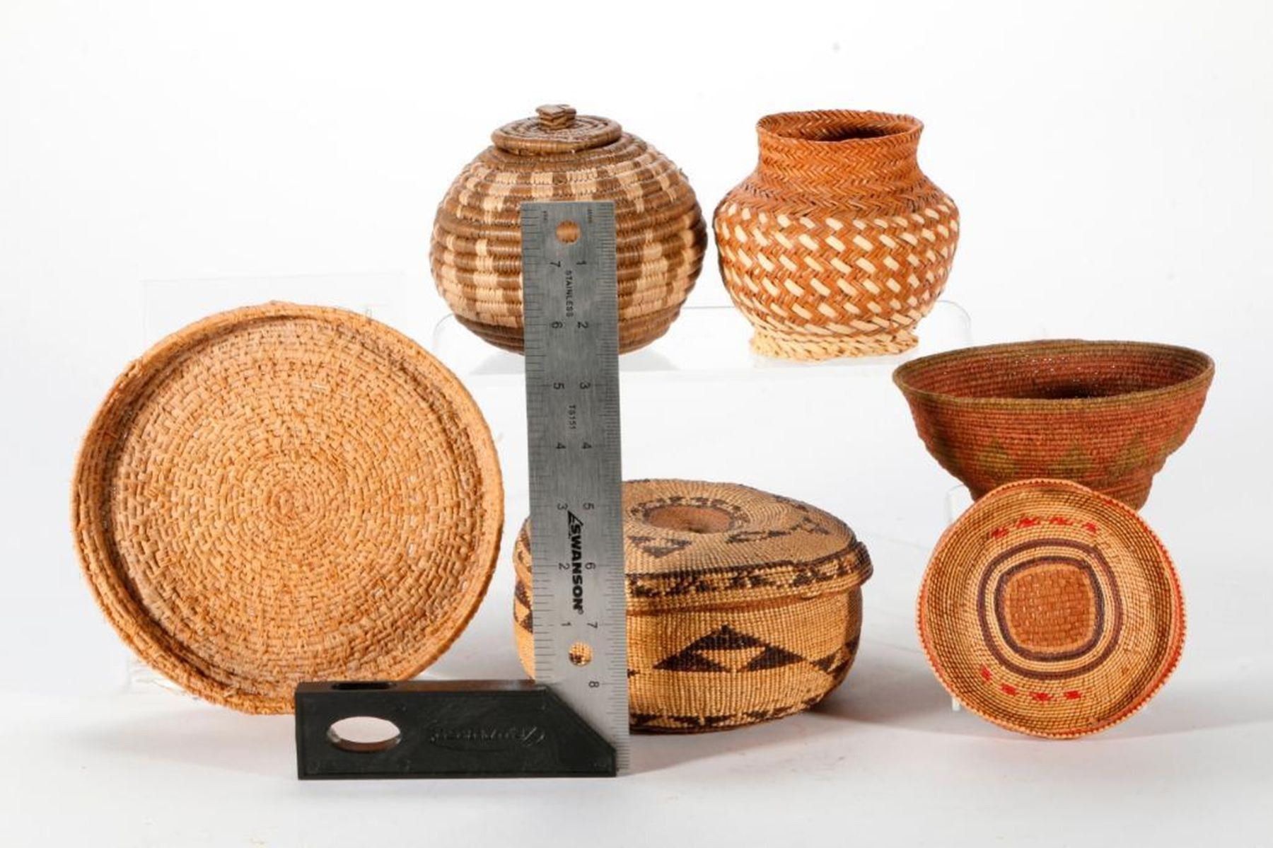 Six Native American baskets one with lid as shown, the largest measuring 3 1/2 inches high x 6.