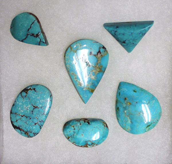 Six Natural Turquoise Cabochons 121.93 CTW. Loose turquoise gem stones in a variety of shapes, longest measures 1 1/2'' x 1'' wide.
