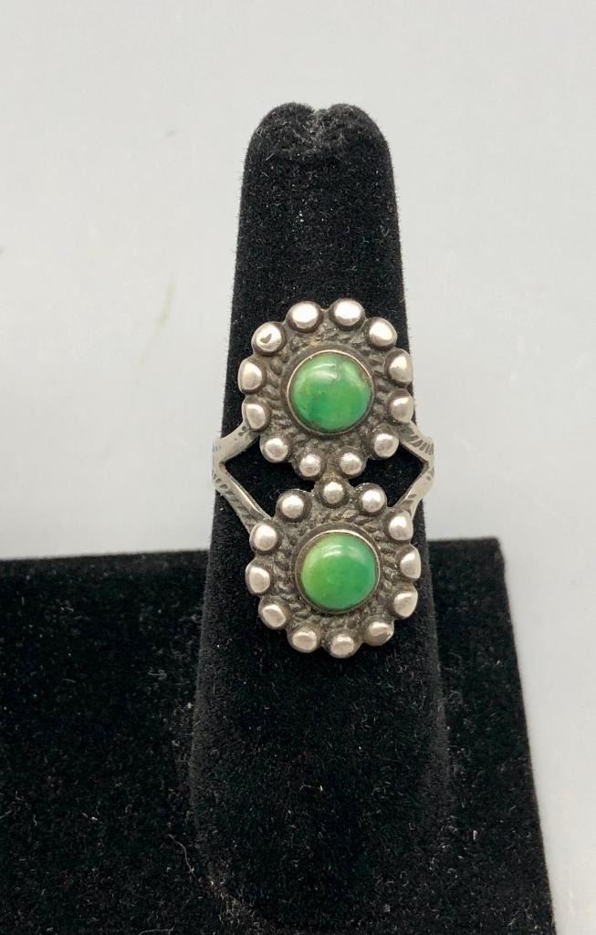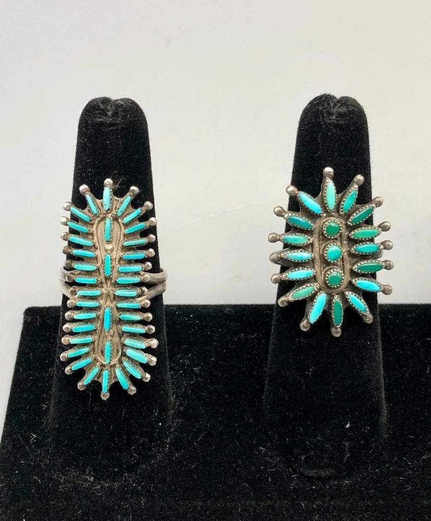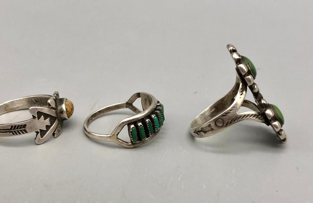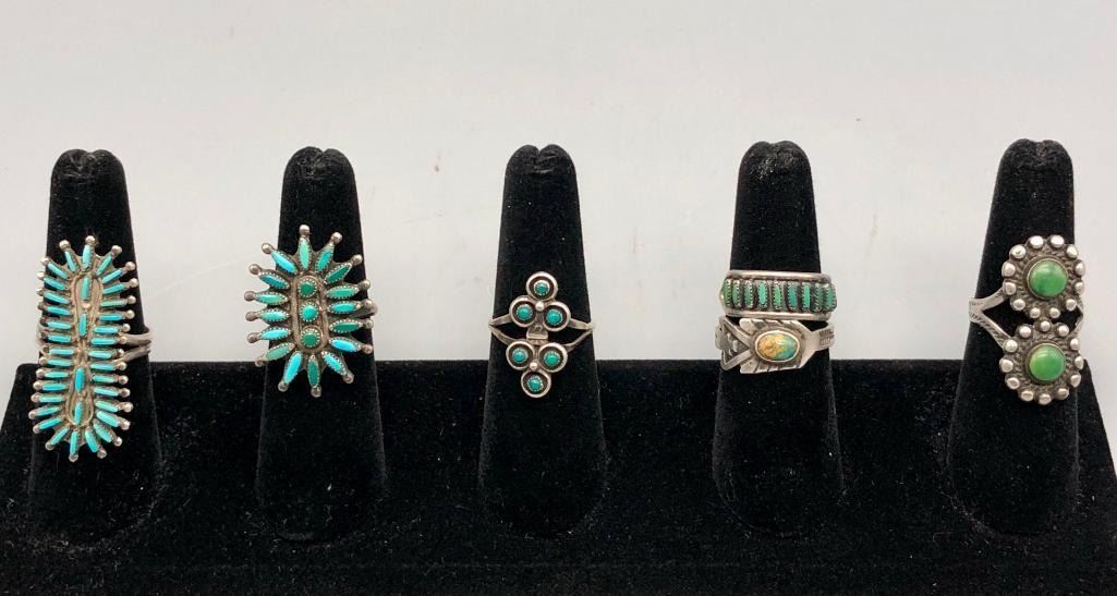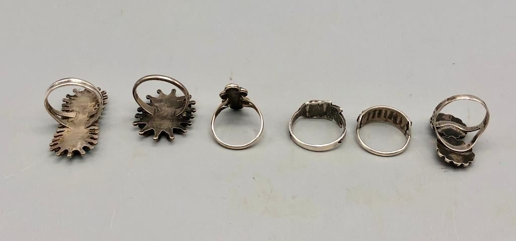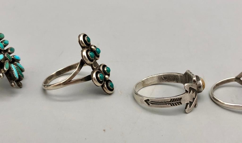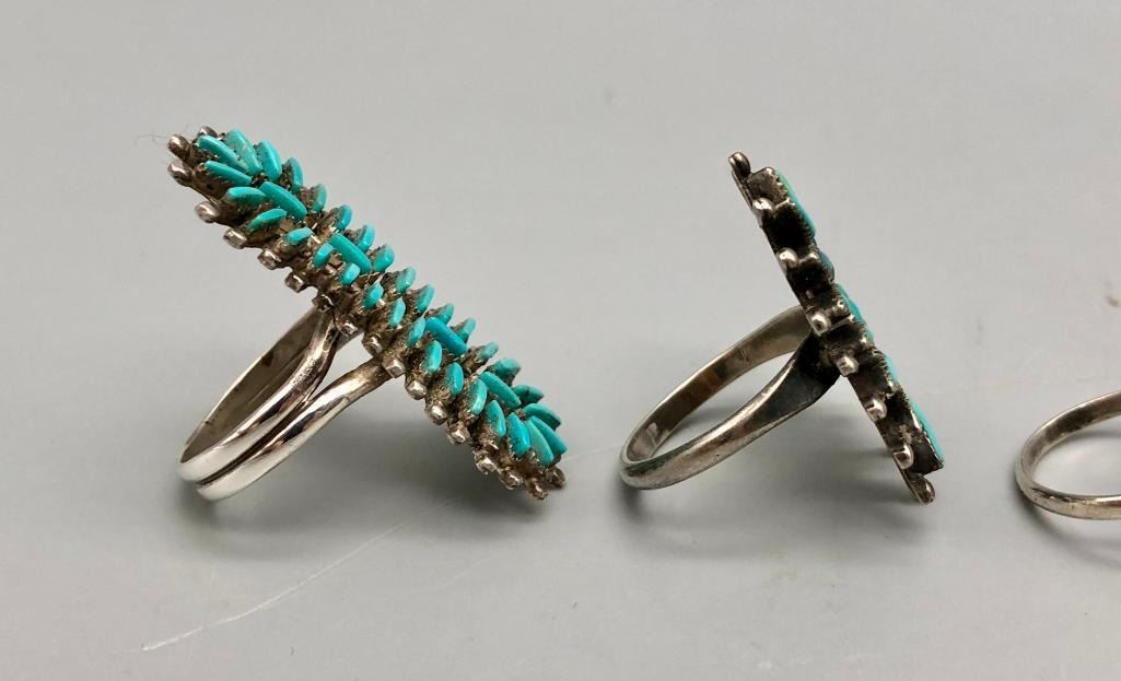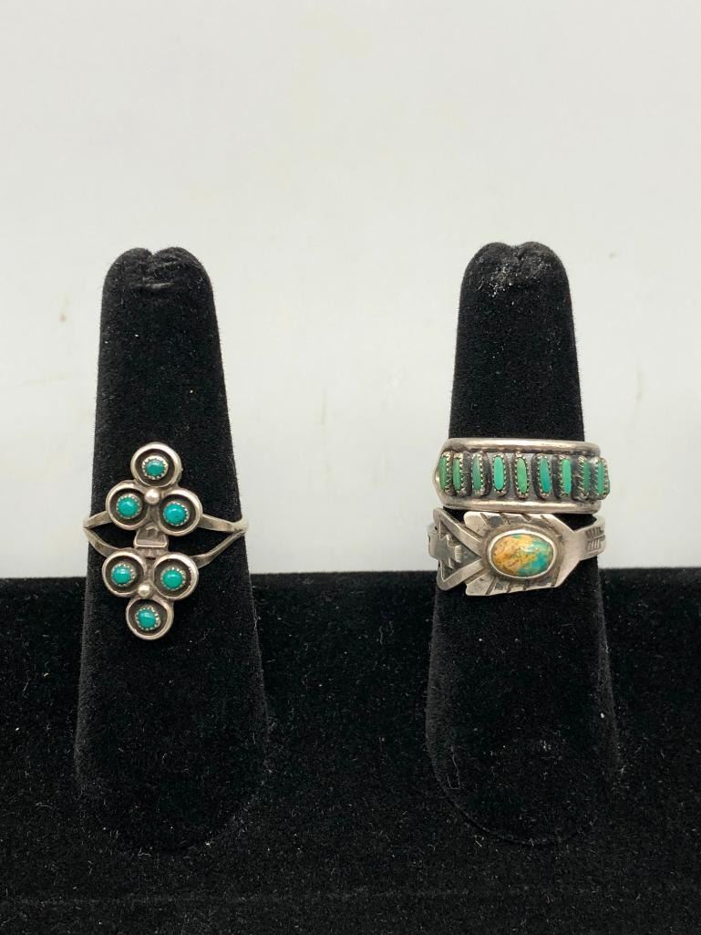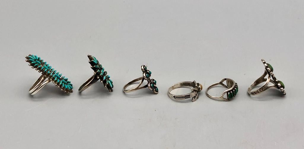 Presented for sale in this lot is a group of six older turquoise rings. All are various sizes and style. All are set with turquoise stones and are made from sterling silver. MAKER: Various. APPROX AGE: Vintage. SIZE: Sizes range from 7.25 -9. Weighs 26.2 grams. CONDITION: Good for their age, normal wear expected. Please look closely at the pictures as they are an important part of our description and are hereby incorporated into the description, specifically with regards to condition. SHIPPING: There will be a $5 handling / packaging fee for shipping this lot. The actual cost of postage will be added on top of that. BUY IT NOW: If you would like to buy this item now, without waiting for the auction day to bid on it, we do offer this option (which is available up to 48 hours before the actual auction starts). The “Buy it Now†price is the high estimate of this lot (plus applicable fees and the Buyer's premium is discounted to 10% when using the Buy it Now option). If you would like to exercise this option, you must contact us by email (or phone as long as you talk to someone live). Reference this lot number and your intention to "Buy it Now."