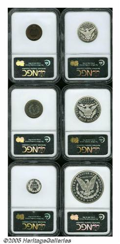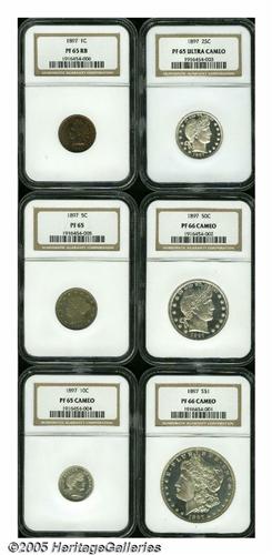 <B>Six Piece 1897 Proof Set PR65 to PR66 NGC.</B></I> The set includes:<BR><B>Cent PR65 Red and Brown.</B></I> Light salmon-pink color dominates, with hints of lemon and orange hues along the borders. Many collectors would not hesitate to call this piece full Red in color. A well struck Gem, no contact can be discerned, although a few tiny carbon flecks are noted.<BR><B>Nickel PR65.</B></I> Lime, rose, apple-green, powder-blue, chestnut-gray, and gold colors endow this sharply struck and nicely mirrored Gem. This undisturbed specimen displays considerable aesthetic beauty, and no marks or carbon exist that appear to limit the grade.<BR><B>Dime PR65 Cameo.</B></I> While the obverse cameo contrast is undeniable, the reverse exhibits spectacularly frosted devices. A brilliant and lovely Gem, the proof mintage of 731 pieces is the lowest nineteenth century production of the type. (This statement is also true for the following Barber Quarter and Half Dollar.) A nearly invisible horizontal slide mark on the neck prevents technical perfection.<BR><B>Quarter PR65 Ultra Cameo.</B></I> Ice-white devices rise above the deeply mirrored fields. An untoned Gem with a penetrating strike and impressive eye appeal. A few tiny mint-made planchet flakes on the reverse and a pair of pinpoint marks on the portrait are barely worthy of mention.<BR><B>Half Dollar PR66 Cameo.</B></I> The radiant snow-white devices appear to merit an Ultra Cameo designation, but NGC has conservatively assessed this brilliant and immaculate premium Gem. The strike is not quite full on the right shield corner or the eagle's neck feathers, but the nearly all details of the design are fully delivered by the dies.<BR><B>Morgan Dollar PR66 Cameo.</B></I> This well struck premium Gem has a fully brilliant reverse, and the obverse exhibits faint apricot toning. Proof Cameo Gem Morgan Dollars are rare, impressive, and in great demand. A wispy vertical imperfection is concealed in the hair beneath the T in LIBERTY. Just 731 proofs were struck, about 150 pieces fewer than the famous proof 1895 Morgan Dollar.