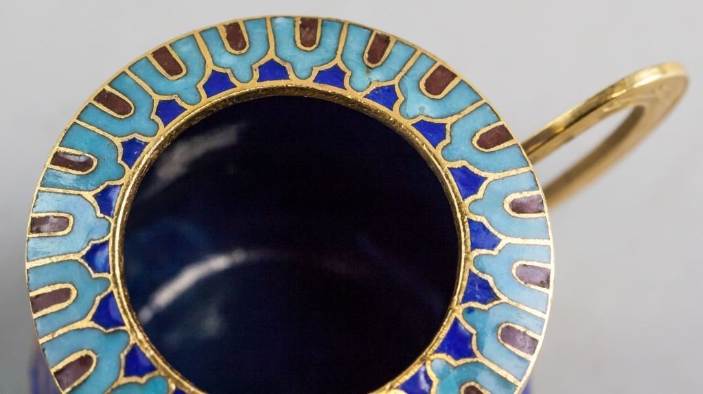 Chinese mini teapot set. Featuring cloisonne work of gold clouds on a blue background, decorated with flowers and birds. Includes mini teapot, four mini cups, and large plate. 8 x 12 cm, 502 grams total.