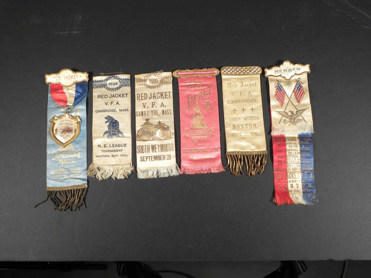 Lot of 6 Red Jacket Firemen's Muster Ribbons. Cambridge, Mass dated 1895-1902. Includes two celluloid badges. Various sizes and conditions.