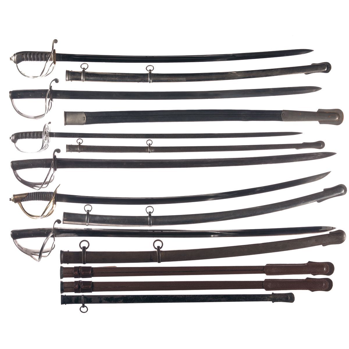 1) Royal Artillery Officers Sword Wilkinson sword, 32 3/4" single fuller blade, wire and rayskin grip, nickel scabbard. Excellent. 2) "ISD" marked 1853 Pattern Troopers sword, 34" single fuller blade, checkered grips, leather sheath. Excellent. 3) Victorian Sword with Gothic Hilt with Wilkinson Rifle Officer's, 32 1/4" etched single fuller blade, cut-through guard, rayskin and wire grip, metal scabbard. Blade very good, remainder fair. 4) 1853 Pattern Cavalry Trooper's Sword, the sword has 35 1/2" single fuller blade, checkered grip, missing scabbard. Fair. 5) Wilkinson marked, 34 3/4" single fuller blade, Farsi markings on ricasso, wire and rayskin grip, metal sheath. Very good. 6) 1853 Pattern Cavalry Troopers sword with scabbard marked "K.V.M.A./ 60", 35 1/2" single fuller blade, checkered grips, metal scabbard. Good. 7) Three extra scabbards, 2 leather covered, one metal. Excellent.