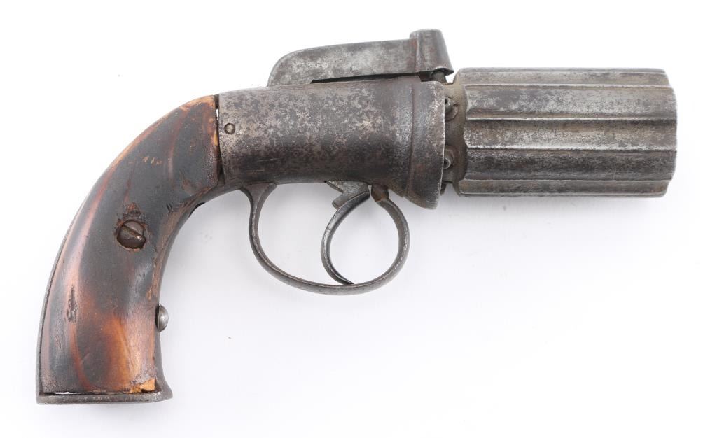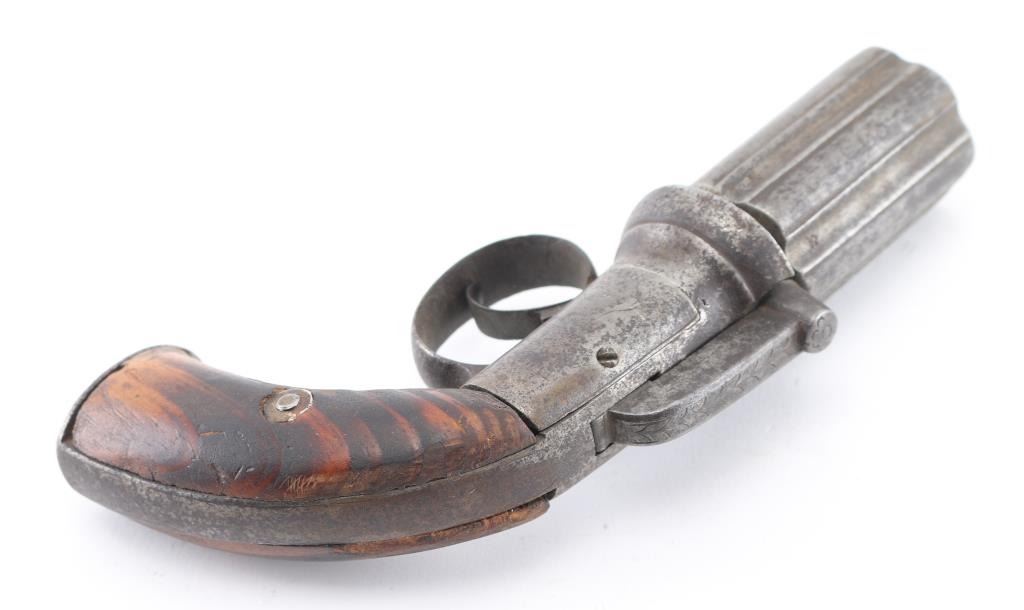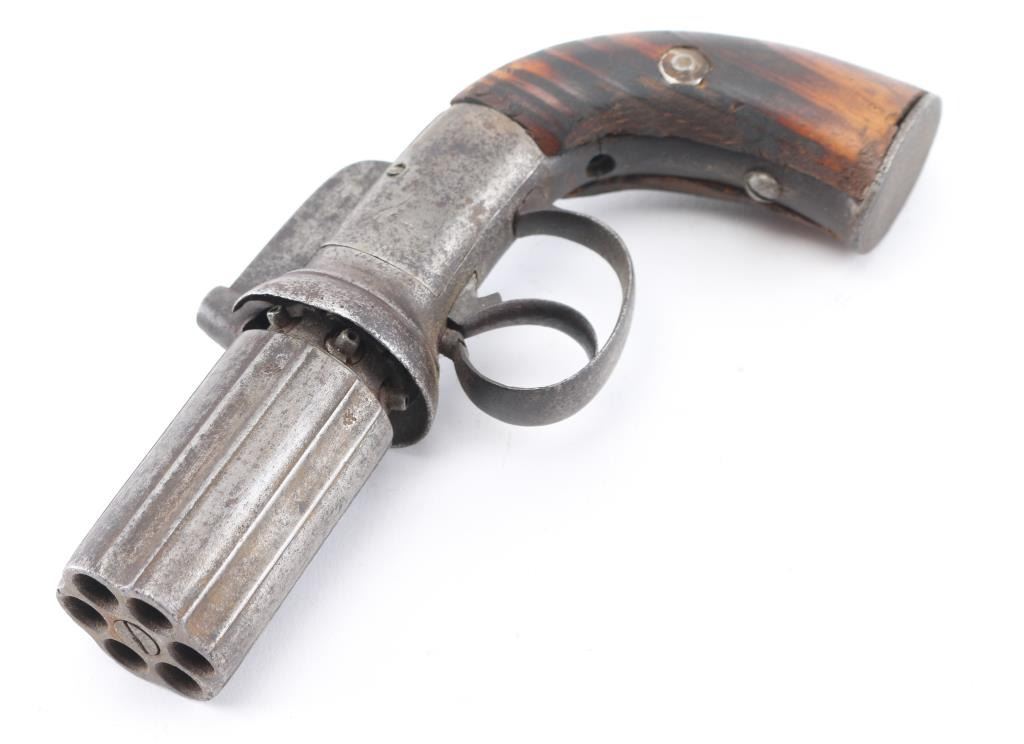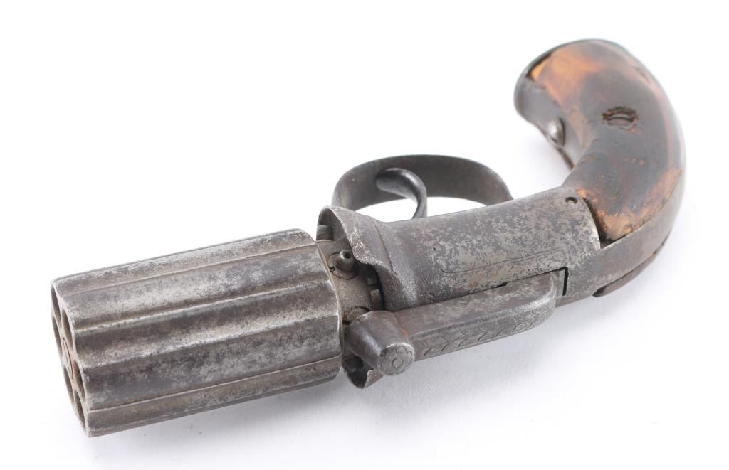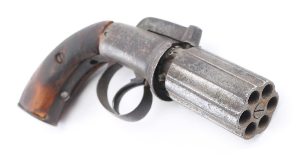 2 1/4" barrel, overall length is approximately 7", steel pistol with two-piece wood grips, smooth trigger, finish is gone, wood has shrunk, muzzle has rust on it. Firearm does not time properly. HANDGUN IS NOT IS IN OPERABLE CONDITION. **NRA Poor** Antique Firearm