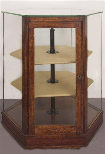 Six Sided Antique Display Case. 30" tall, 24" wide. Oak. Fine condition. (est $400-500)