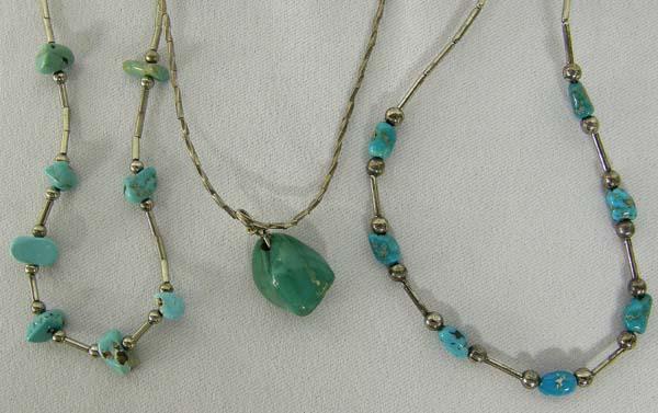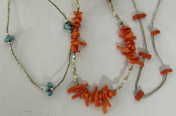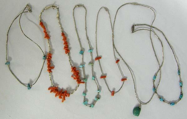 Six Silver Turquoise Coral Necklaces and Chokers, 2 necklaces and 4 chokers, longest measures 18''. SHI $15.
