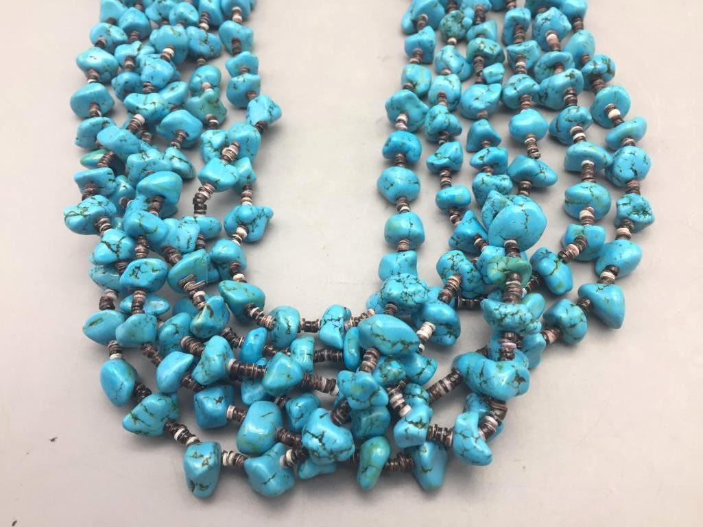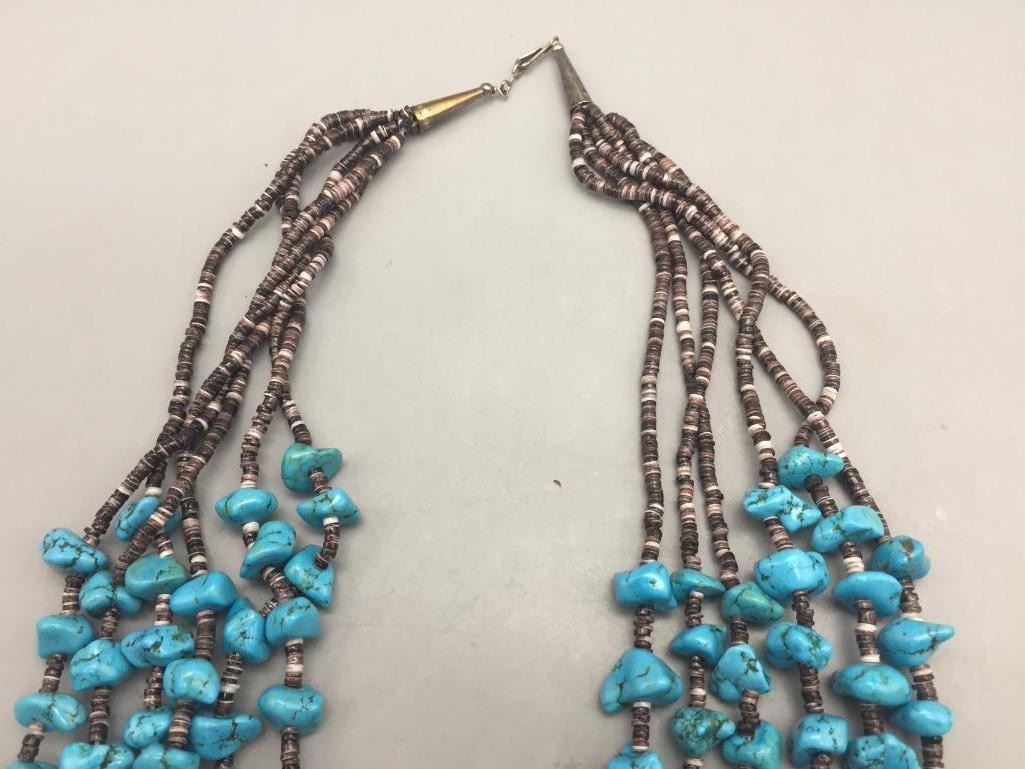 For sale in this lot is a gorgeous, six strand heishi and turquoise necklace. It has great, pebble sized turquoise stones with darker colored heishi beads. This is definitely a statement piece! Maker: Unmarked. Approx. Age: Vintage. Size: Fits a 26 inch neck. Weighs 277.7 grams. Condition: Good for its age, normal wear expected. Please look closely at the pictures - they are an important part of our description. Shipping: There will be a $5 handling / packaging fee for shipping this lot. The actual cost of postage will be added on top of that. BUY IT NOW: If you would like to buy this item now without waiting for the auction to end (this option is only available up to 48 hours before the auction starts to close), the “Buy it Now” price is the high estimate of this lot. If you would like to end the auction early and pay the high estimate (plus applicable fees), please contact us by phone or email and reference this lot number.