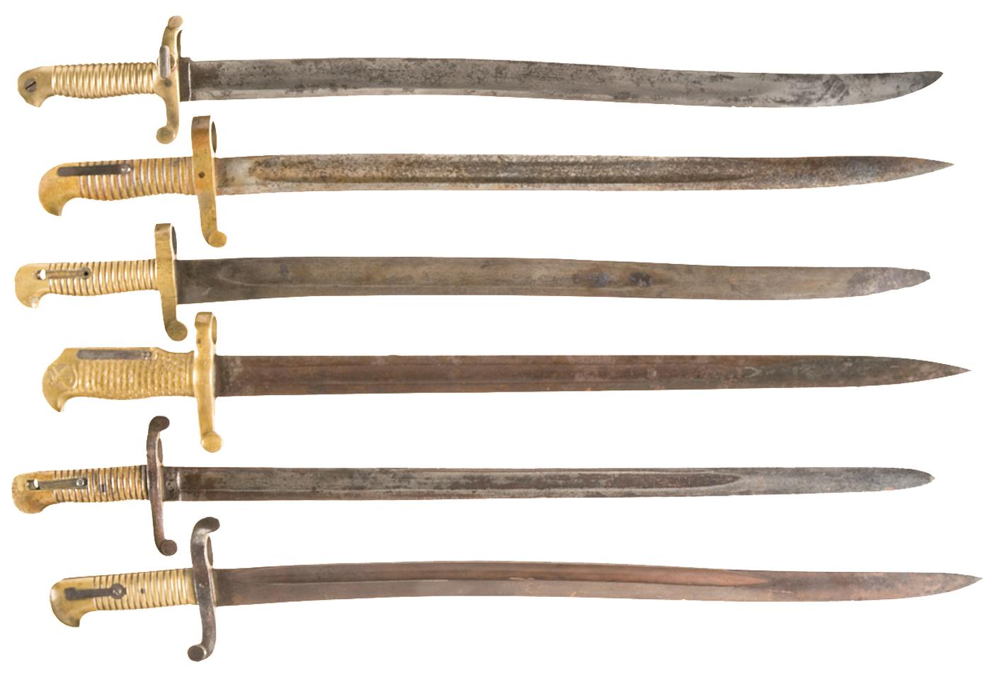 All bayonets in this lot have cast brass hilts, which are ribbed unless noted otherwise. 1) M1855 Sword bayonet for M1841 rifle, 22 1/4" unmarked single fuller blade with a thumbscrew lock in the collar. 2) M1863 Remington bayonet, 20" blade, "C" stamped on the left ricasso and right guard, and "B.H." behind the collar. 3) Unidentified bayonet wirh Yataghan pattern blade, 21 1/2" single fuller blade, mounting hardware absent. 4) U.S. Ames Sword Co. marked bayonet for U.S. Navy M1870 rifle. 20" straight single fuller blade with scale pattern grips and crossed cannon marks on the pommel. 5) Spencer M1863 Navy rifle bayonet with 23 5/8" double fuller straight blade, with a small proof on the right ricasso, iron guard, mounting hardware absent. 6) S&K marked bayonet, for Colt revolving rifle with 22 5/8" single fuller yataghan blade with makers mark on the left ricasso, and iron guard.
