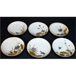 Six Victorian Mintons aesthetic style plates, transfer printed and decorated in gold and silver with kingfishers, storks and ducks amongst reeds, impressed marks to back