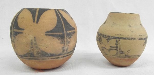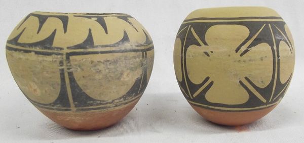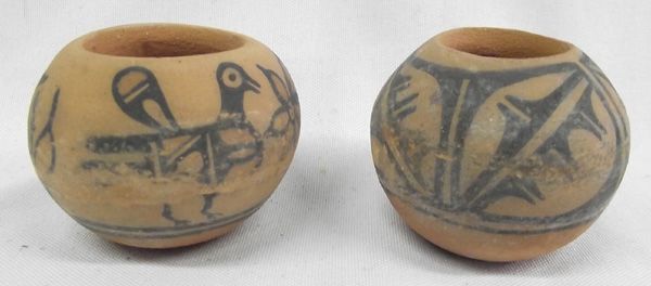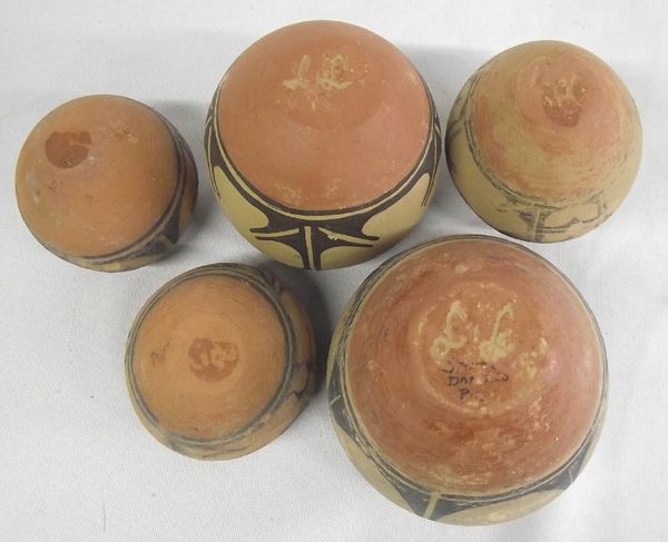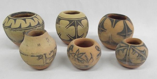 Six Vintage Santa Domingo Miniature Pots, 5 are signed with 2 cursive L's and one includes Santo Domingo Pue. Largest measures 2.75''H x 3.25'' diameter. Paint is worn off on some and some chips for age.