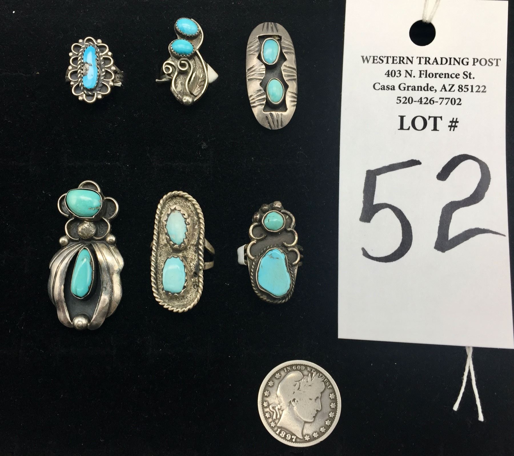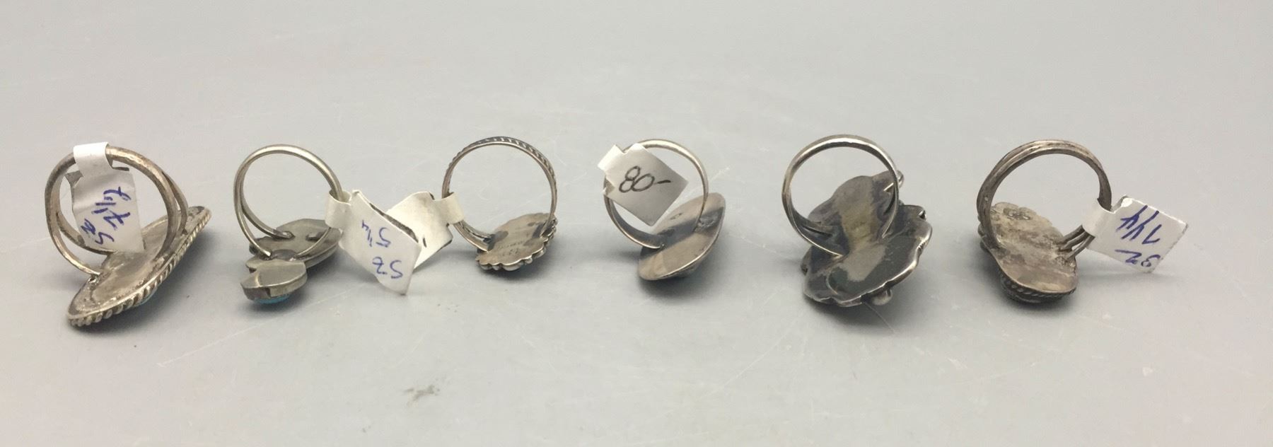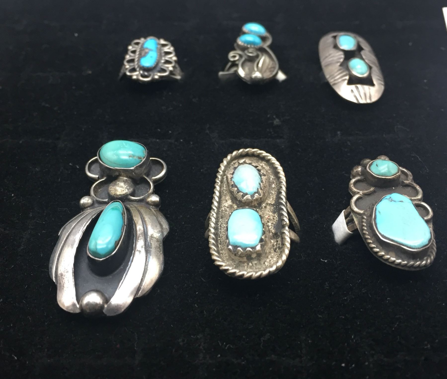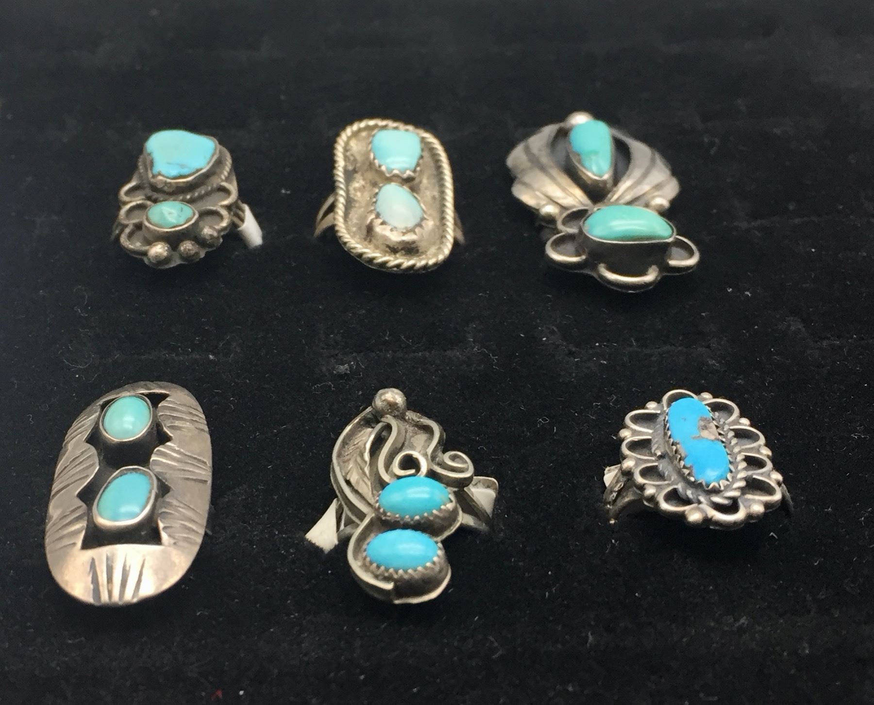 Description: For sale in this we have a group of six vintage rings set with various turquoise stones. Various sizes and styles. All are sterling silver. Maker: Various. Approx. Age: Vintage. Size: Various sizes. Combined weight is 38.2 grams. Condition: Good for their age, normal wear expected. Please look closely at the pictures - they are an important part of our description. Shipping: There will be a $5 handling / packaging fee for shipping this lot. The actual cost of postage will be added on top of that.