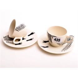 Six Wedgwood cups and saucers "Man Friday" pattern in black and white