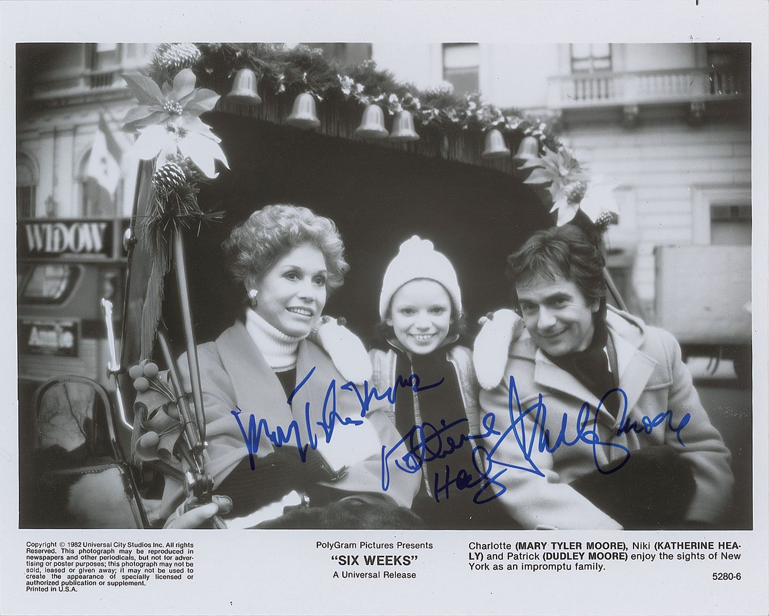 Glossy 10 x 8 Universal Pictures publicity photo of Dudley Moore as Patrick Dalton, Mary Tyler Moore as Charlotte Dreyfus, and Katherine Healy as Nicole from the 1982 film Six Weeks, signed by each in blue felt tip. In fine condition. From the Harvey and Rhoda Kuflik Collection.