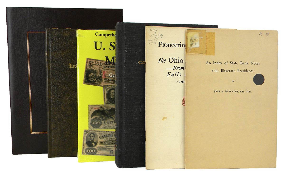 [Paper Money]. SIX WORKS ON PAPER MONEY. Includes: a reprint of Knox’s 1885 United States Notes; the third edition of Edkins Catalogue of United States Coal Company Store Script, Volume I (Exclusive of West Virginia), by Williams and Ratliff; the sixth edition of Hessler’s Comprehensive Catalog of U.S. Paper Money, still in the original shrink-wrap; Rowe’s 1948 Pioneering and Money in the Ohio River Valley (ex-library copy); Muscalus’s 1939 An Index of State Bank Notes that Illustrate Presidents (ex-library copy); and the program of the First International Paper Money Convention, 1985. Varying formats, first two titles hardcover. Very good or better unless otherwise noted. Includes some substantial works.