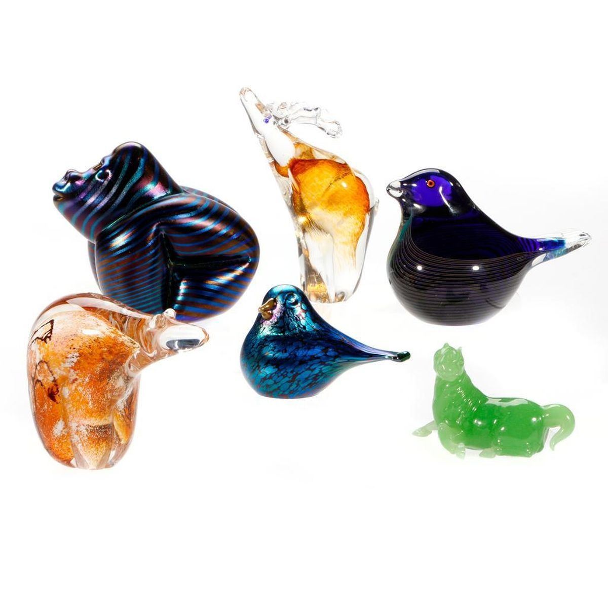 Six art glass paper weights by Orient and Flume, Paul Crosbie, etc in the form of animals.
