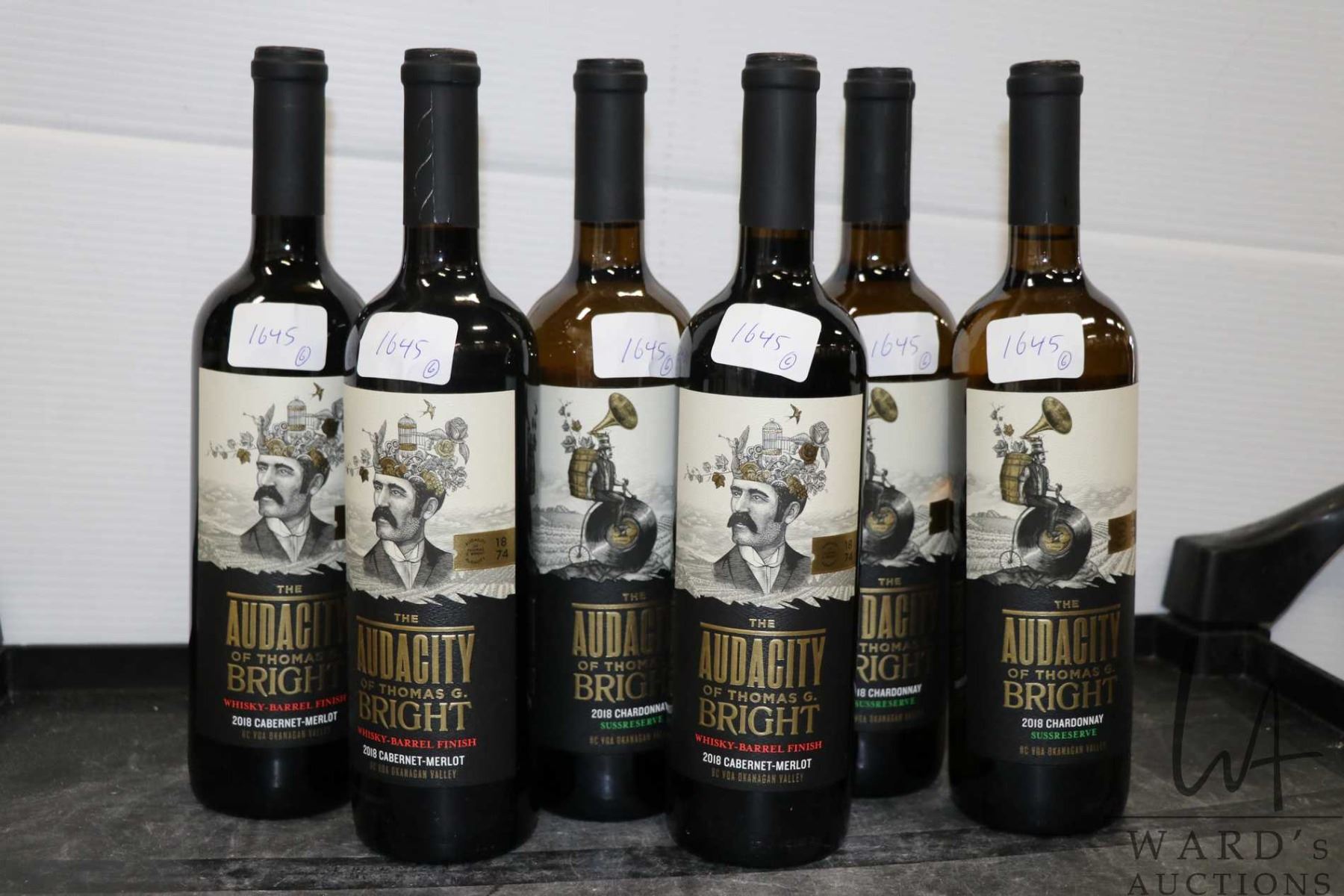 Six bottles of The Audacity of Thomas G Bright including three bottles Cabernet-Merlot 2018 750ml, and three bottles Chardonnay 2018 750ml Note: Alcohol cannot be insured by any courier in Canada. Local pick up is recommended. Canadian bidders only