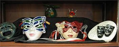 Six colorful decorative masks made of various materials. The largest stands about 7" tall and the smallest 2 1/4"