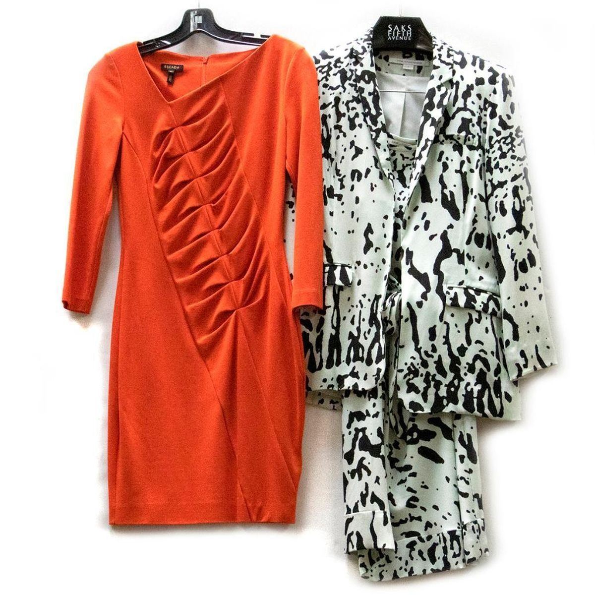including: Diane von Furstenberg silk dress & jacket, sz 0; red Escada, sz 34; Giorgio Armani knit jersey polka dot, sz 4; (3) by Adrianna Papell, one sz 12 silk, one sz 10 cotton, and one evening gown ,sz 12