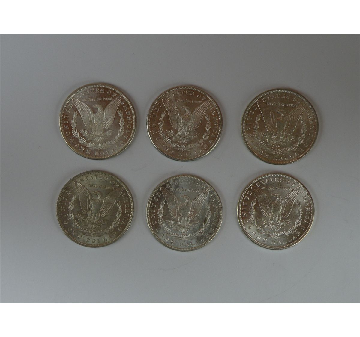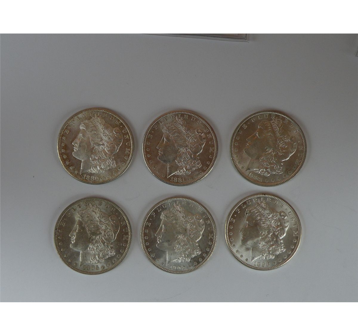 Six different mint state branch mint Morgan Dollars: 1880-S, 1881-S, 1883-O, 1885-O, 1898-O, 1902-O. All are easily Br. Unc. with claims to a Choice classification. A total of 6 coins. Est.$265
