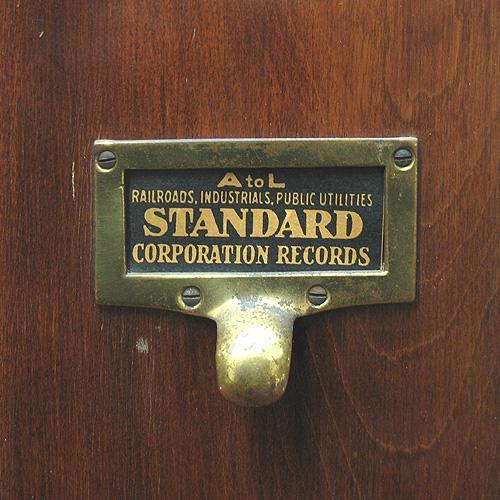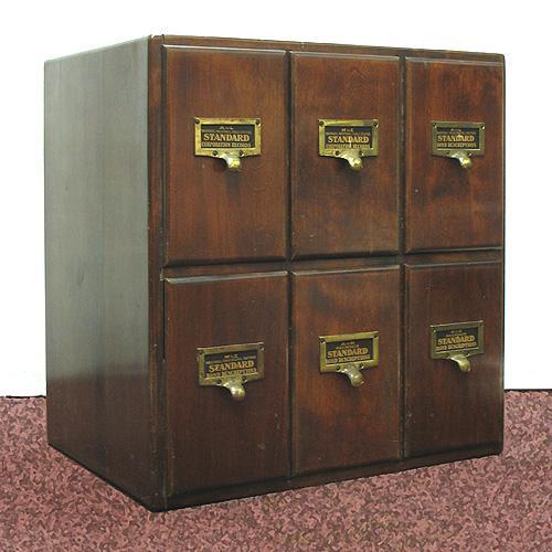Six drawer mahogany card file; dovetailed construction "Standard Corporate Records" on two drawers and "Standard Bond Descriptions" on four drawers; C.1900; 22" high x 21" across x 15 1/2" deep (no visible defects)