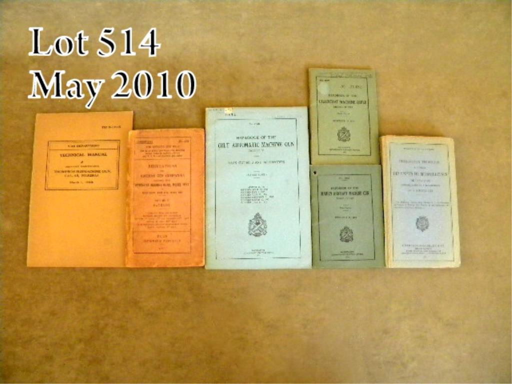 Six hard-to-find original military Handbooks and Instruction Manuals for WW I and WW II era machine guns all in good condition including 1) U.S. Ordnance Department Government Printing Office (1917 dated)”Handbook of the Colt AutomaticMachine Gun Caliber .30 with Pack Outfits And Accessories with two fold outs and a total of 53 pages; 2) U.S. War Department Technical Ordinance Manual (TM 9-1215) for Thompson Submachine Gun Cal .45, M1928A1 dated March 1, 1942 with 28 pages;3) Regulations For Machine Gun Companies Equipped With Hotchkiss Machine Guns, Model 1914 on Tripod Mounts, Model 1915 Omnibus Type, dated 1917 with numerous fold outs in addition to 95 pages and marked on the cover “Not to be taken into frontline trenches; issued down to include officers and N.C.O.s of machine gun units”; 4) U.S. Ordinance Department Government Printing Office (1917 dated) “Handbook of the Chauchat Machine Rifle Model of 1915” with fold-out in addition to 45 pages;U.S. Ordinance Department Government Printing Office (1918 dated) “Handbook of the Marlin Aircraft Machine Gun Model of 1917 with fold-out in addition to 72 pages; 6)Instruction Manual for Military Techniques with weaponry and in battle,