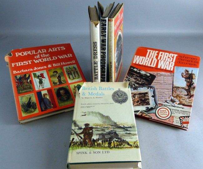 Six military related books Early War Photographs Popular Arts of the 1st World War The Victorian Army The First World War Battle Dress British battles and Medals