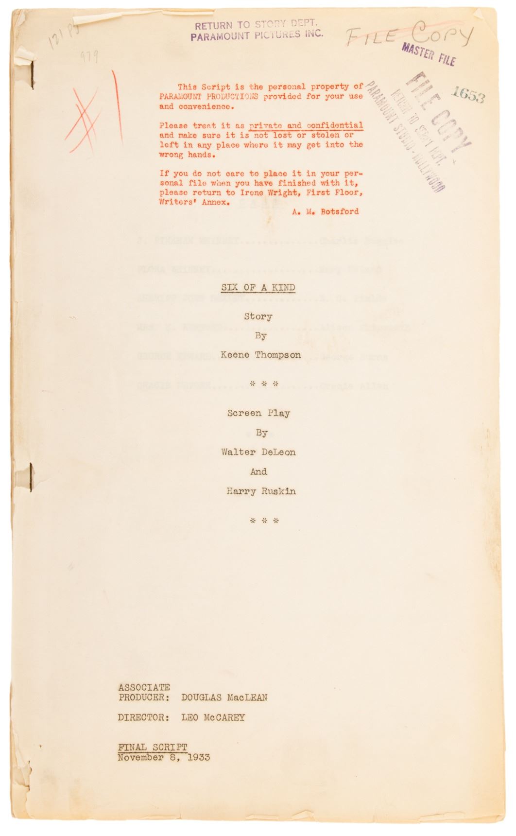 10. Six of a Kind Final Cutting Continuity script. (Paramount, 1934) Vintage original 70+ page studio staple-bound Master File Copy Cutting/Continuity script for Six of a Kind story by Keene Thompson and screenplay by Walter DeLeon and Harry Ruskin. Dated on the cover November 8, 1933. W.C. Fields plays "Sheriff John Hoxley" in the film. Exhibiting age, some loose pages and handling. In vintage good condition. $200 - $300