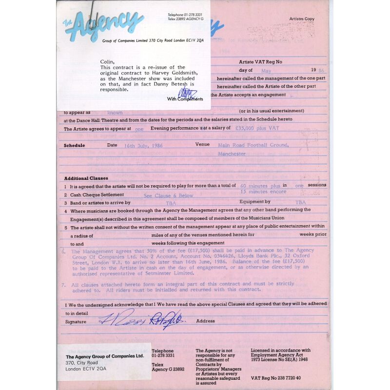 A six page contract for a Status Quo performance at Manchester City's Main Road football ground which took place on July 16th 1986.