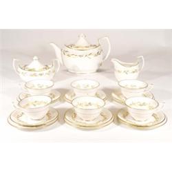 Six place Royal Worcester Saguenay patterned teaset, hand gilded with sprigs of flowers comprising teapot, twin handled sugar bowl and cover, milk jug, six cups, saucers and side plates