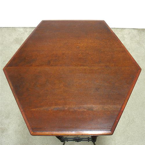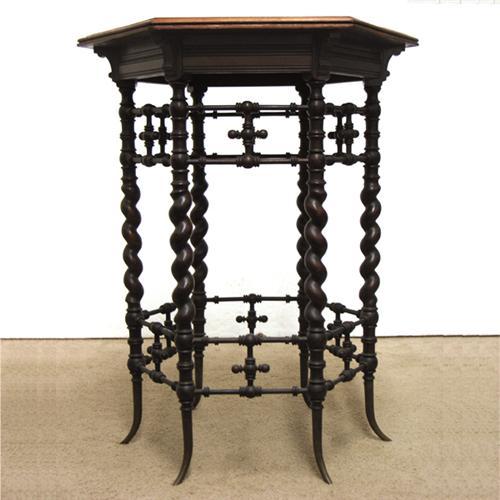 Six sided mixed woods Victorian table; six rope twist legs ending in brass feet; stick and ball decoration; late 19th C.; replaced top