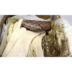 Six various bonnets, to include: one sewn with pearls and diamantes, two pairs of Lady's kid gloves.