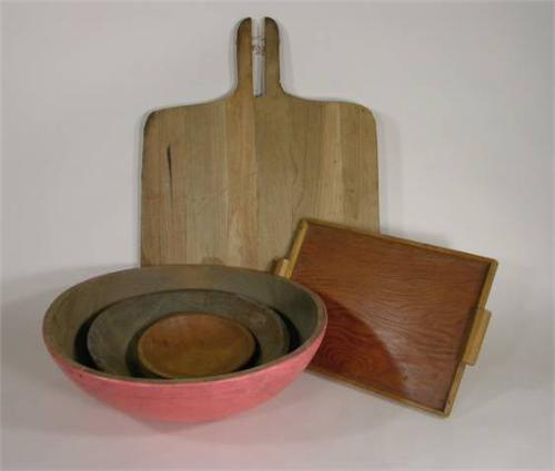 Six various wood items including three early bowls, tray & baking paddle. Good Cond.