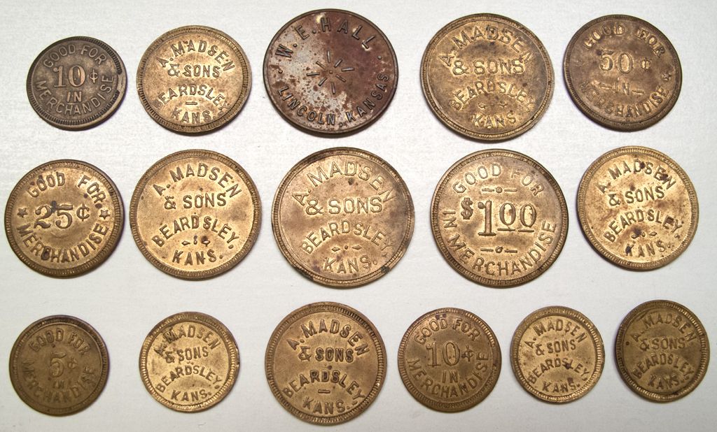 1) WE Hall / Lincoln / Kansas // GF 50c IM. 2) Three sets of A Madsen & Sons / Beardsley, Kansas. GF 5c, 10c, 25c, 50, $1.00 IM.