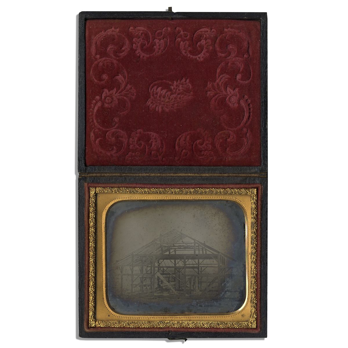 Rare architectural ambrotype from the mid-1800's of a building structure under construction with men standing at the center of the structure and on its roof. Sixth-plate ambrotype is housed in a full, intact case with red velvet interior. Case measures 3'' x 2.25'' with ornate designs and slight wear overall. Hinge closure is perfectly intact. The image is clear with light spotting and foxing to edge of photos. Rare architectural image.