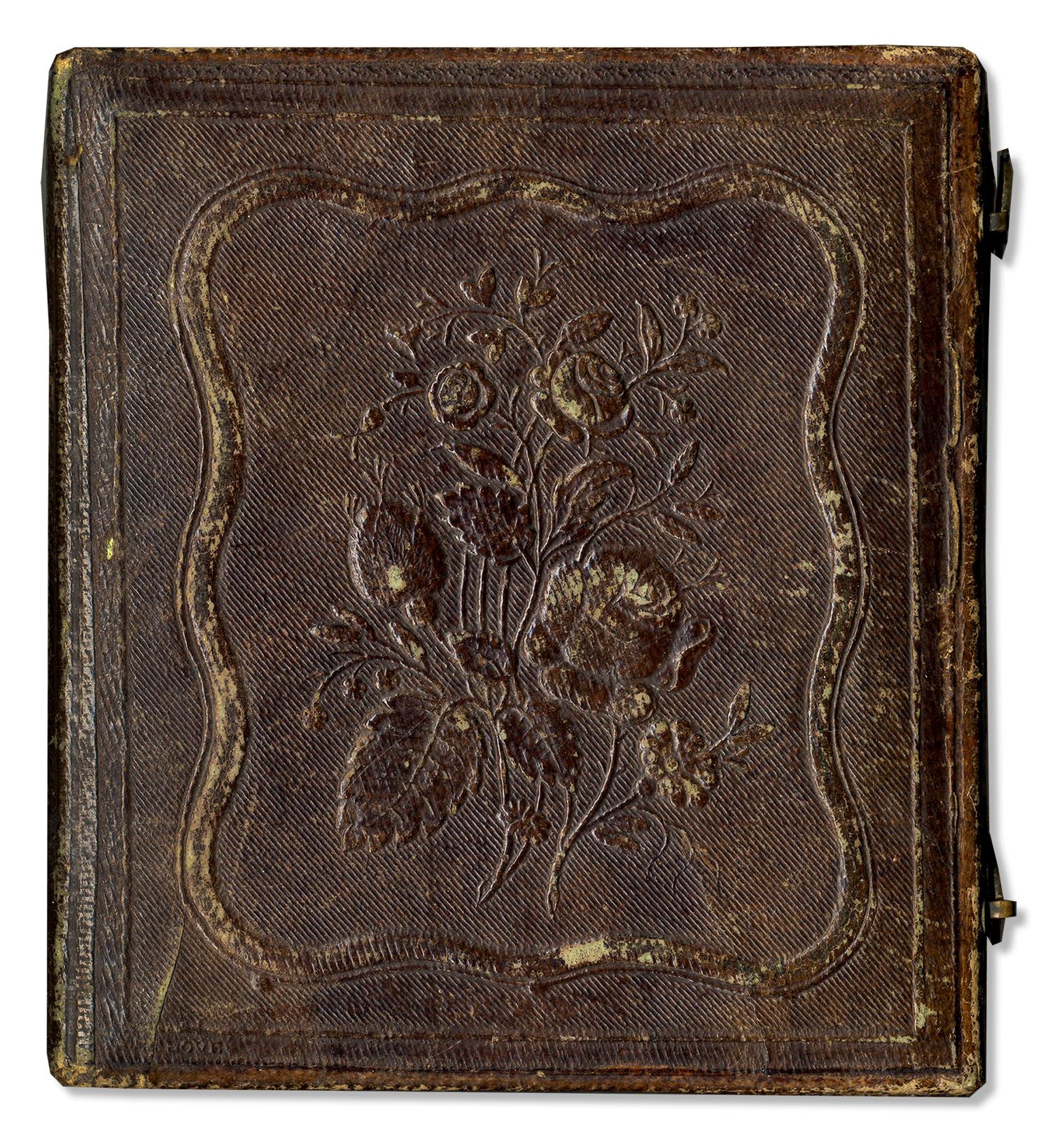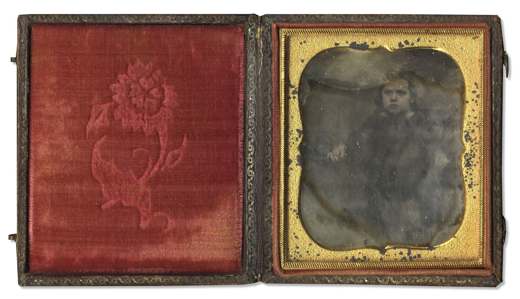 Sixth-plate daguerreotype of a little girl housed within a leather tooled case. Lovely image shows water damage. Preserver and mat intact. Nice image.
