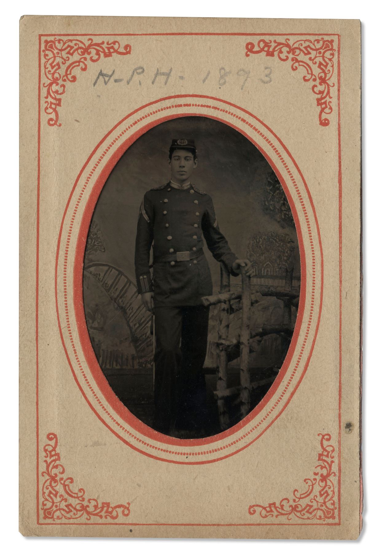 Sixth-plate tintype of a lanky young American soldier posed with chest out in full uniform. He stands in full view with his hand resting on a fence. There are crossed cannons on his collar and embroidery on his epaulets. Penciled on front: ''H.P.H. 1893.'' Penciled on reverse: ''Otis. 2nd Lieut. Nov. 1893. H.M.D. Hyde Park H.S. Battalion.'' Measures 2.5'' x 4''. Very good detail and contrast. One minor bend in upper left corner and minor surface scratches. Very good condition overall.