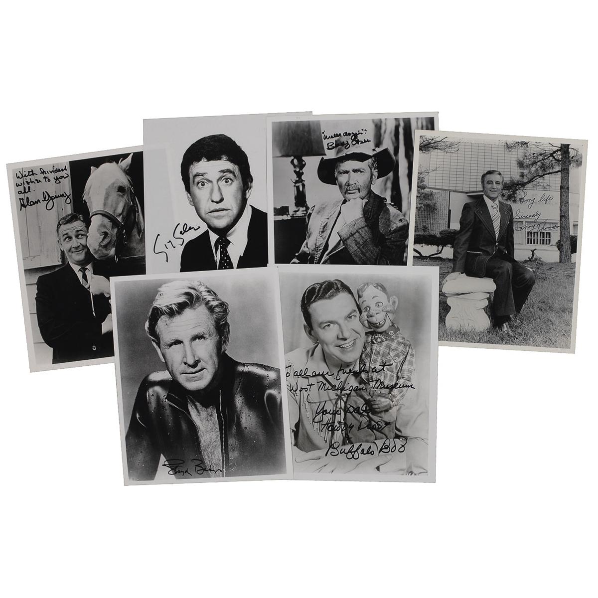 Six 8 x 10 photos, five glossy and one cardstock, each signed in black felt tip by the respective actor shown. Signers are: Lloyd Bridges, Buddy Ebsen (adding “Welll doggie”), Soupy Sales, Buffalo Bob Smith, Danny Thomas, and Alan Young. In overall fine condition.