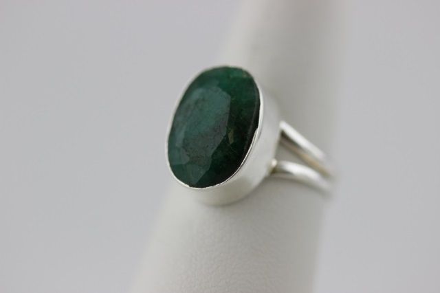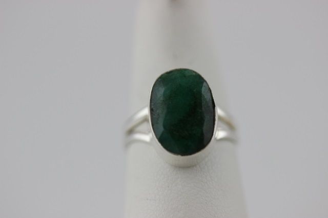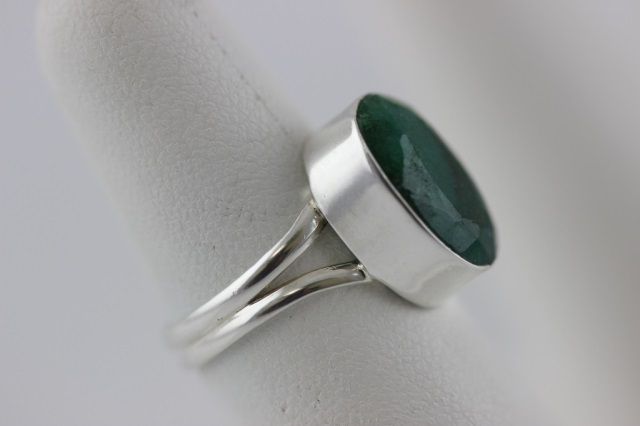 Size 6 3/4 ring with a large 14 by 10 mm faceted natural Emerald gemstone set in Sterling Silver. 3.9 grams total weight