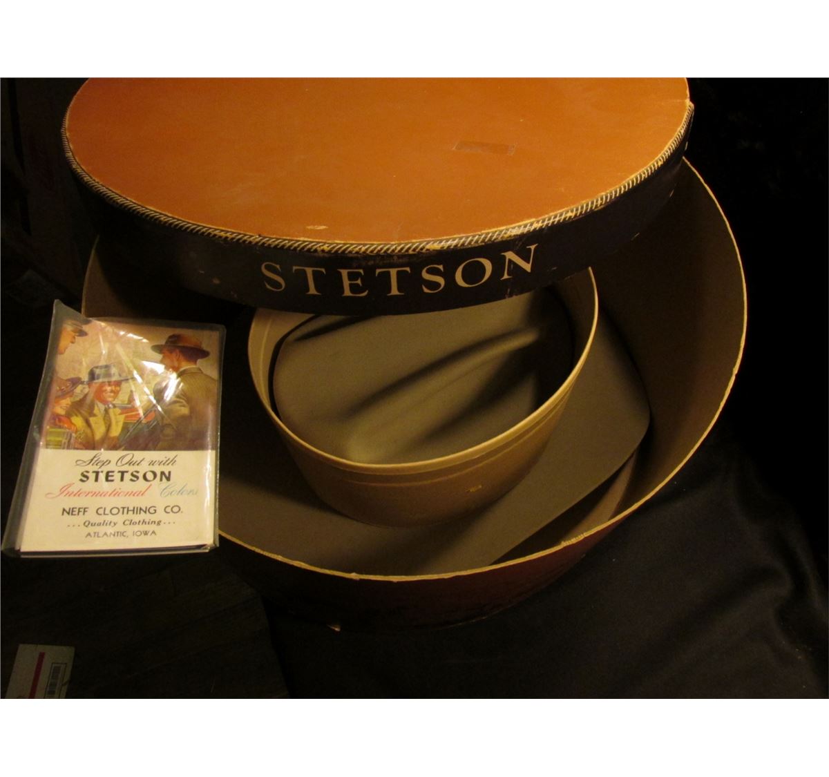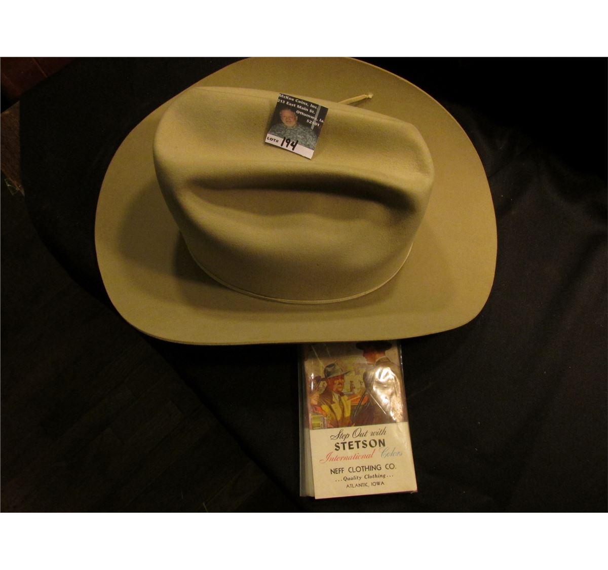 Size 8 Men's Stetson Western Style Felt Hat in original box & a large group of at least (20) 1939 era Advertising Cards "Step Out with Stetson International Colors Neff Clothing Co. …Quality Clothing… Atlantic, Iowa", which 'Doc' was selling at $4.00 each.