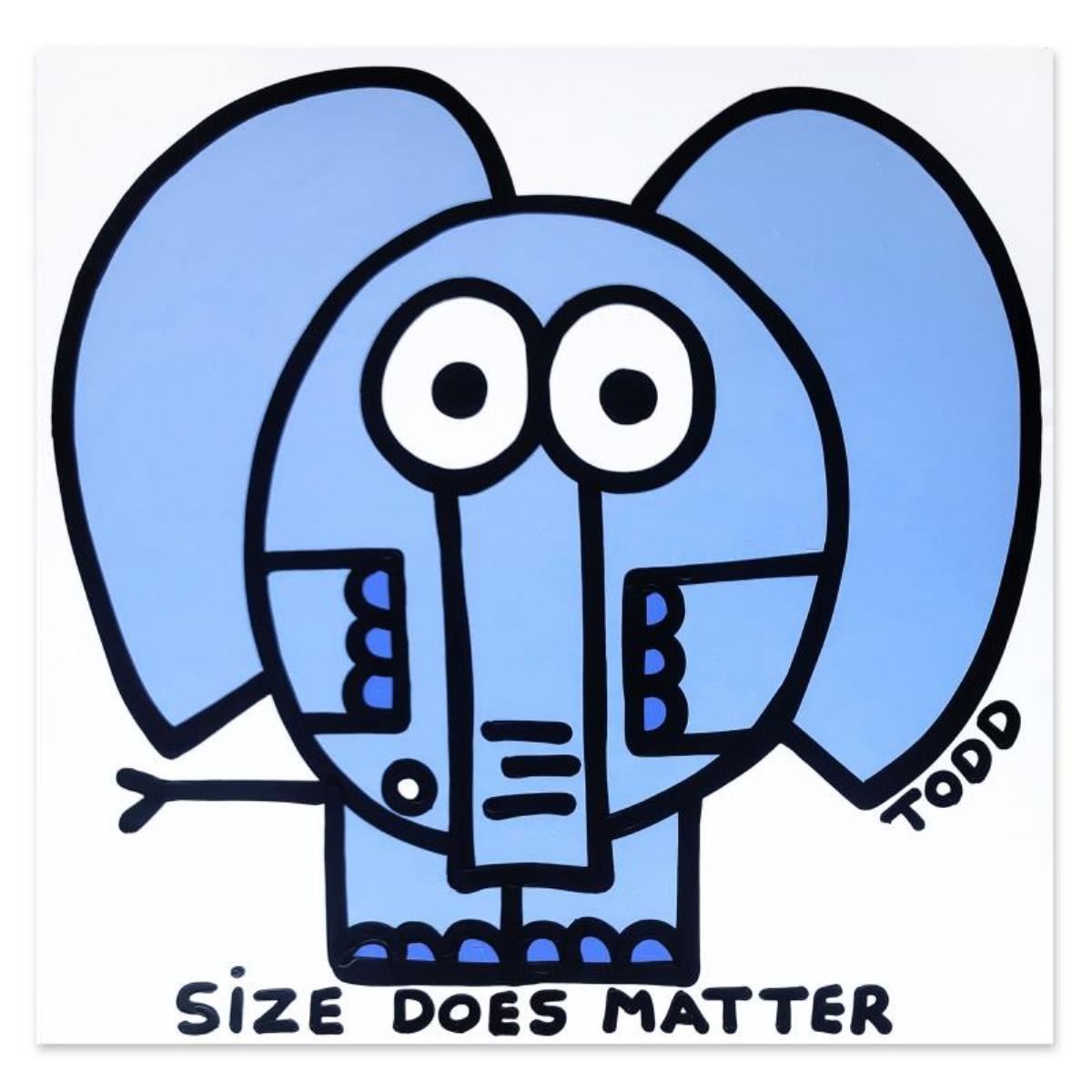 Size Does Matter by Goldman Original. "Size Does Matter" is an original acrylic painting on gallery wrapped canvas by Todd Goldman. The piece is hand signed by the artist and includes a letter of authenticity. Measures approximately 48" x 48" (image).