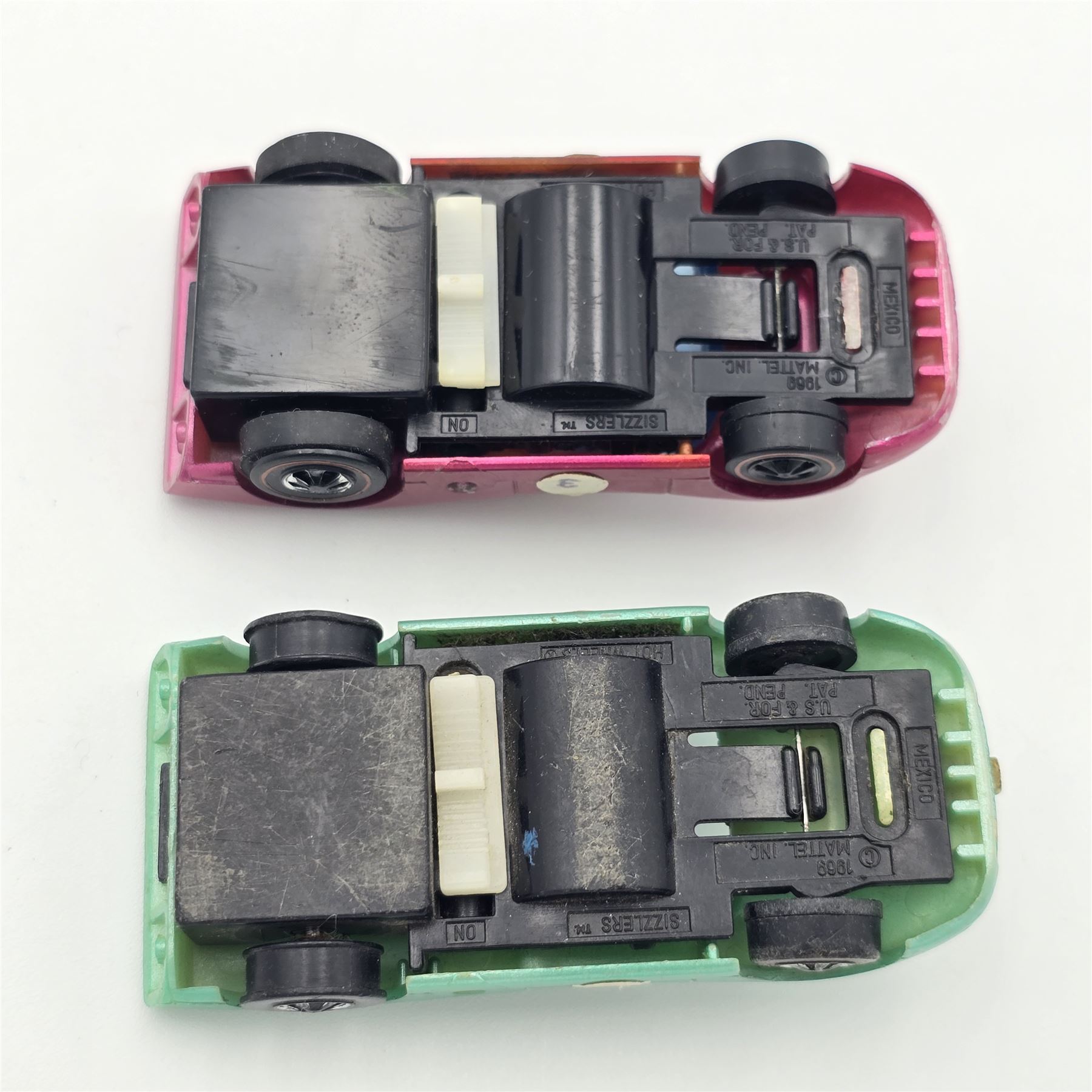 Includes green and rose, both have some spots of color loss to the body, green is missing its window glass, both have wear to the wheel chrome as seen