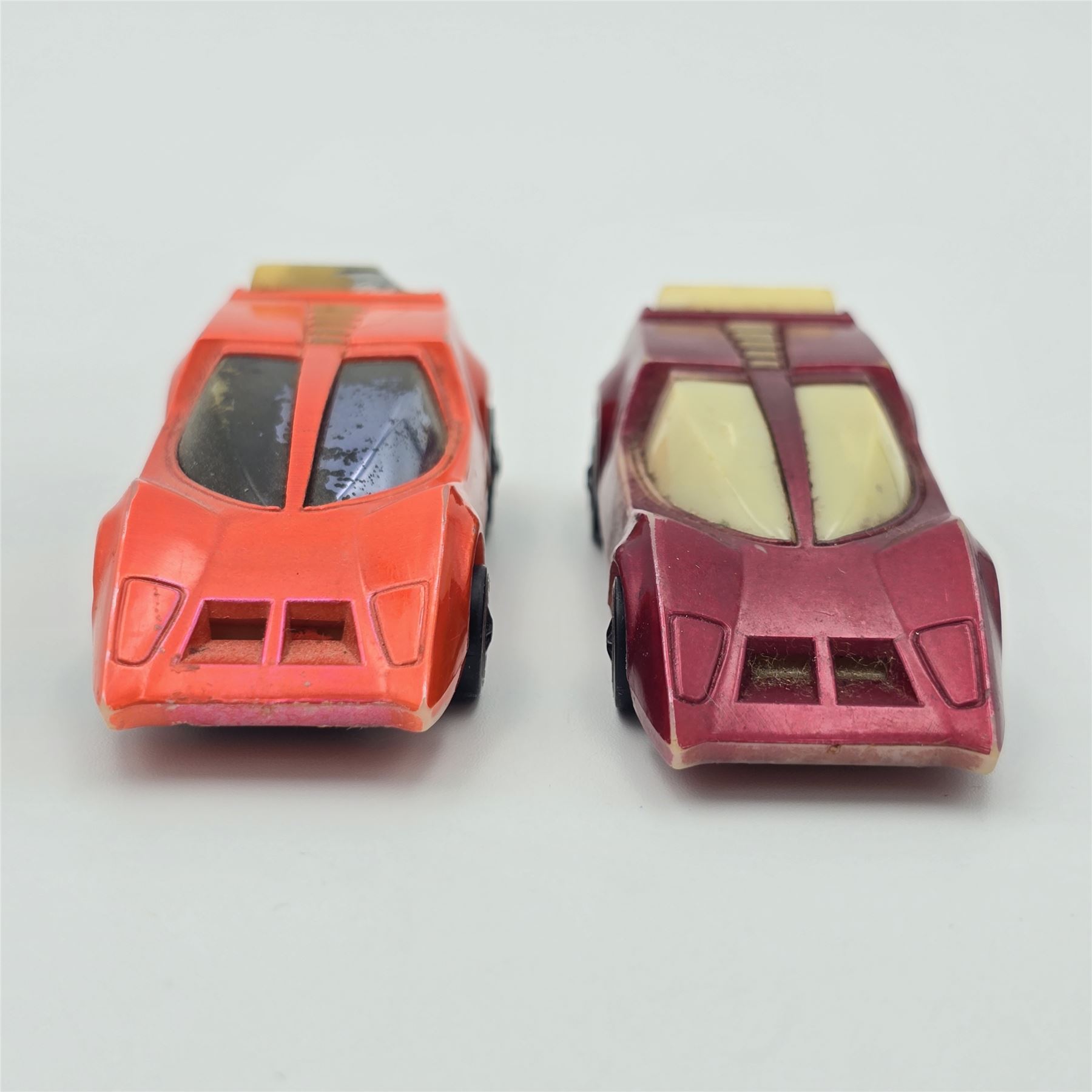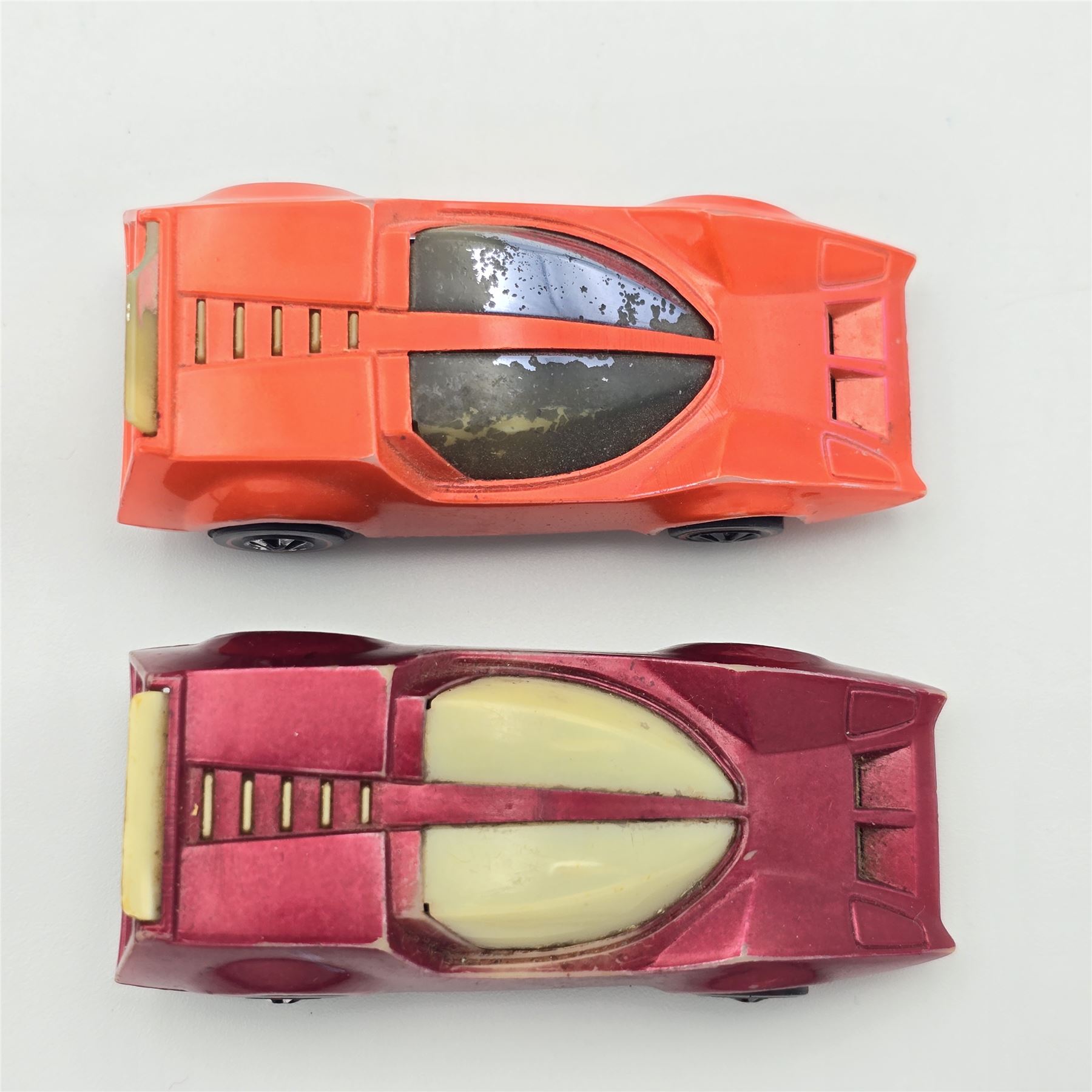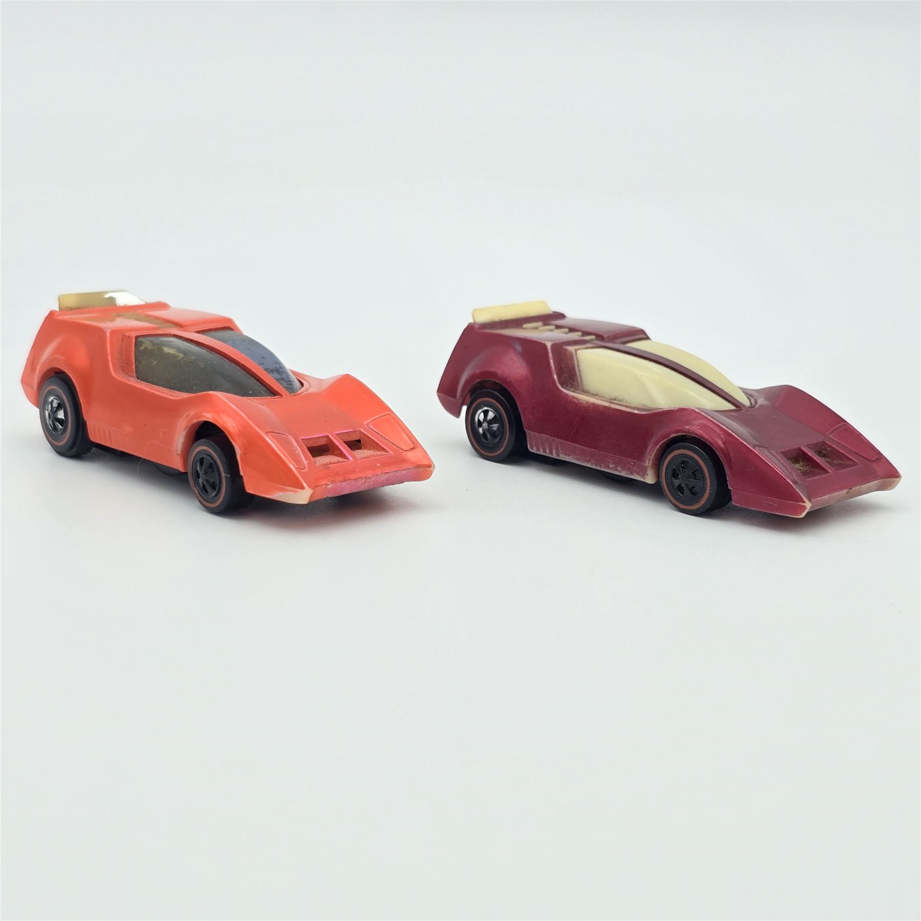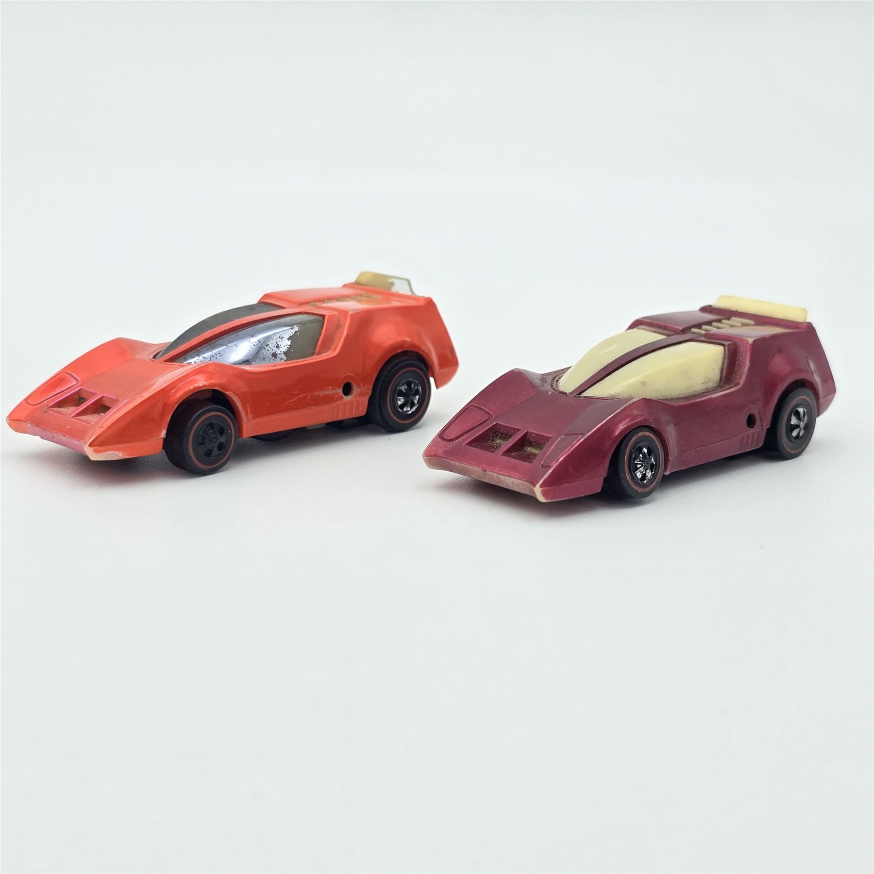 Includes magenta and salmon, both have solid color overall with both having minor color loss to lower front edges as seen, salmon has a chipped rear spoiler, both show chrome loss