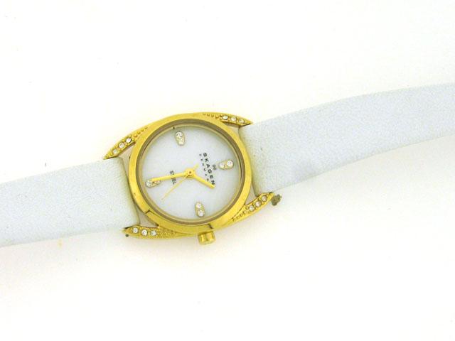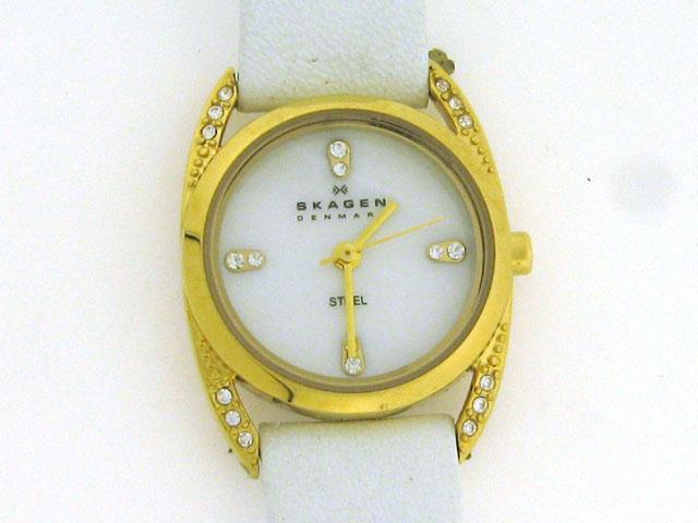 This is a Skagen Ladies Watch with the following features: Mother of Pearl Dial; Swarovski crystal embellishments; Japan quartz movement; Gold tone Stainless Steel bezel with Swarovski crystals; Leather strap; Silver tone hands; Swarovski crystal dot hour markers; Mineral crystal; Push/pull crown; 22 mm case diameter; 6 mm case thickness; and Water resistant.