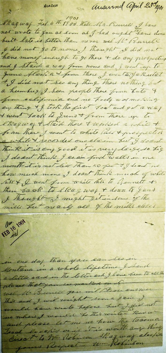 This is a handwritten letter from Skagway, Alaska, dated April, 23, 1901. It was written by a Mr. Will Robinson to a Mr. Russell. The letter is in regard to mine prospecting in various locations throughout Alaska. Mr. Robinson discusses the outlook on future mining endeavors, and his opinions on weather or not any of the proposed locations will yield any profit. The letter is in good condition with little to no damage.