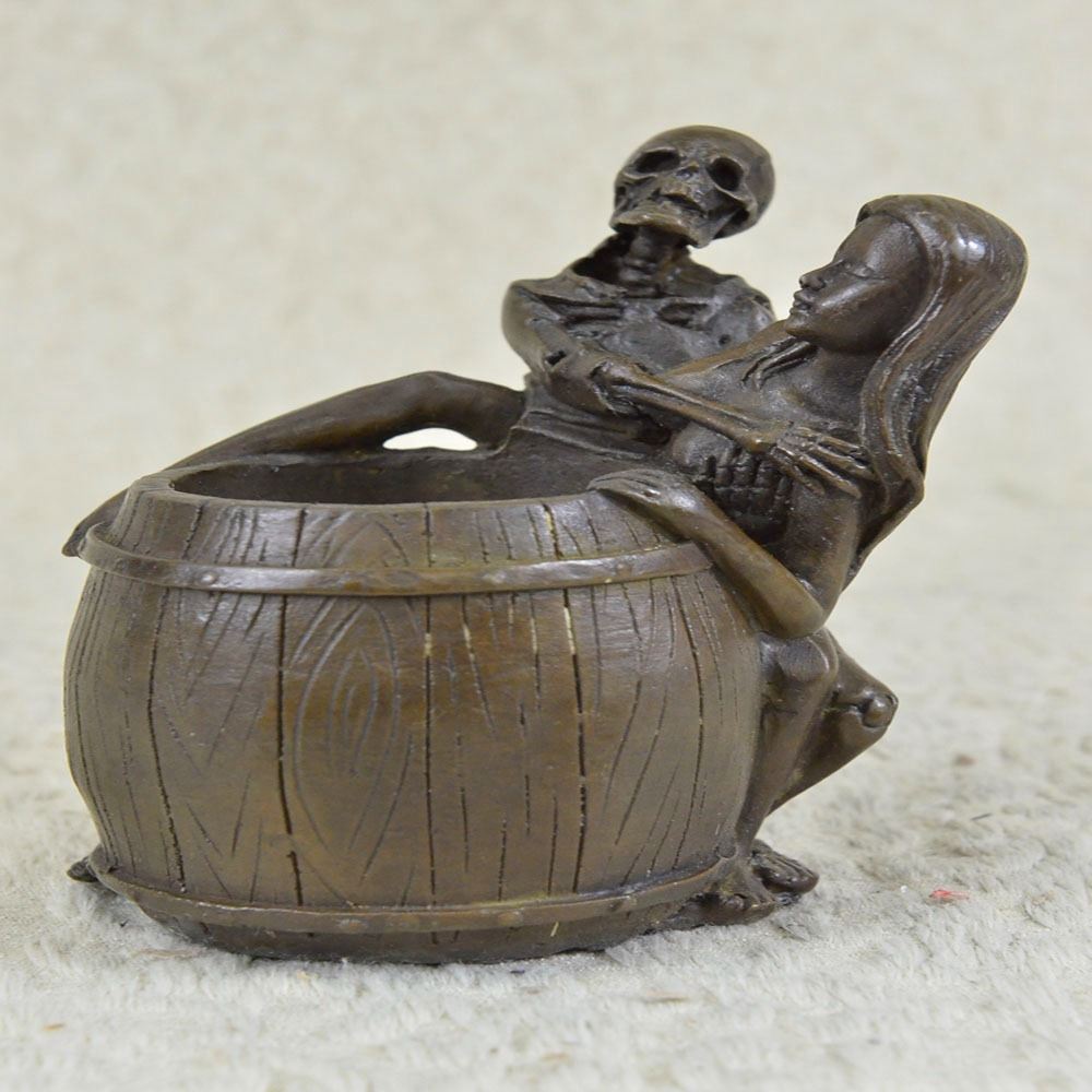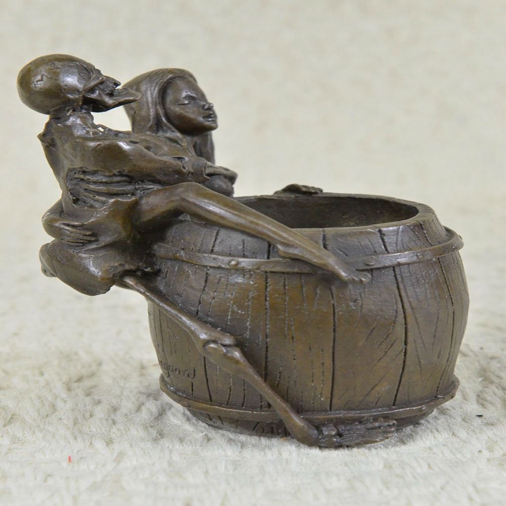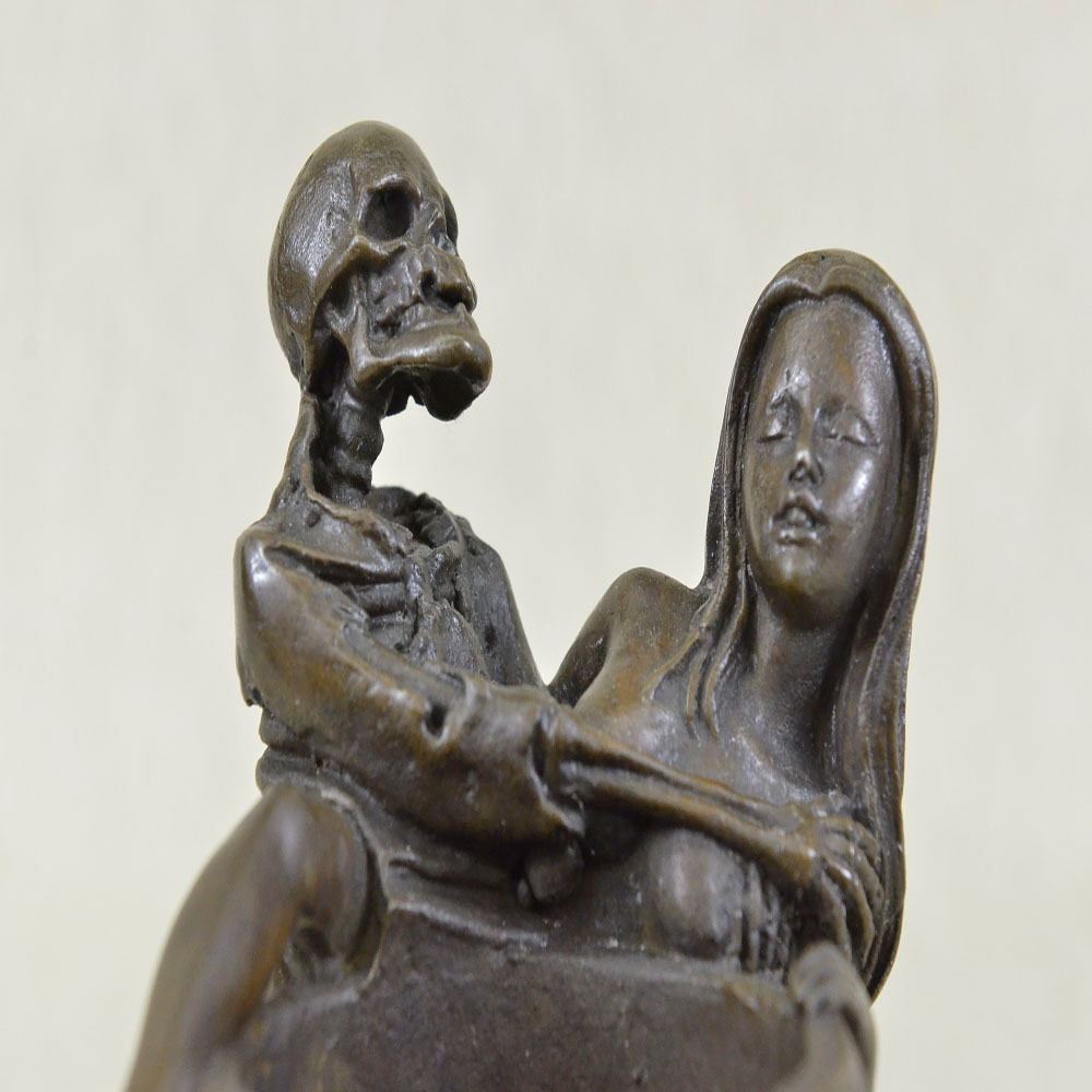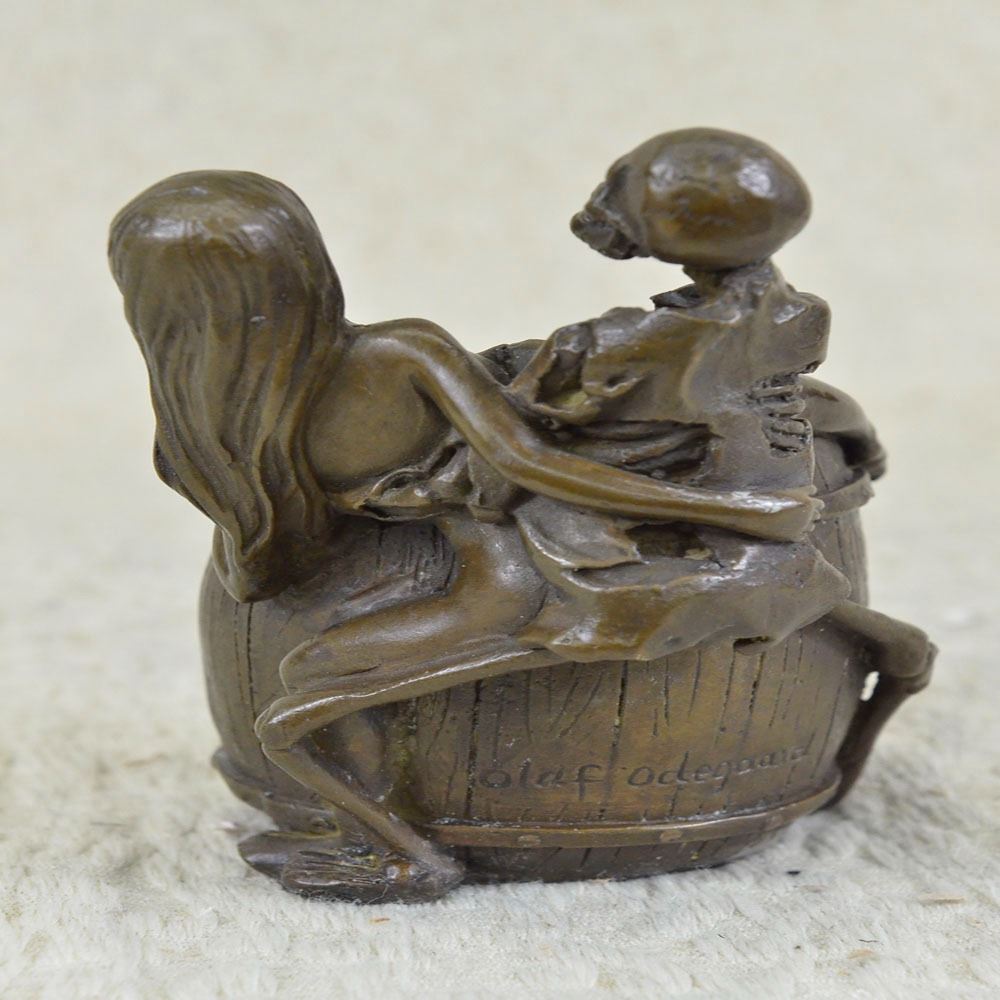 Skeleton holding a nude nymph pen Holder, Cool, Unusual and Creepy item for the morbid of taste. Made to last with pure Bronze, the bottom covered with felt. This Bronze Sculpture was cast using the Lost Wax Method and has a two-tone brown patina. Dimensions: Height 5 X Width 4 inches. Weight: 3 LBS.